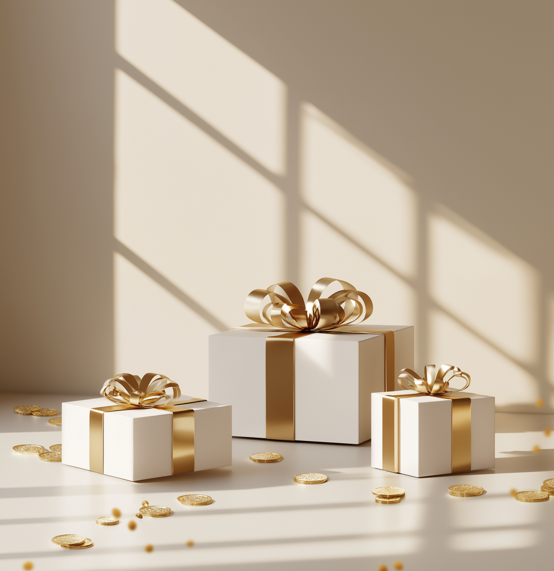 The image features an arrangement of white gift boxes adorned with golden ribbons, resting on a table under warm sunlight. A minimalist and sophisticated atmosphere is created with metallic decorations and scattered small gold coins on a beige backdrop.