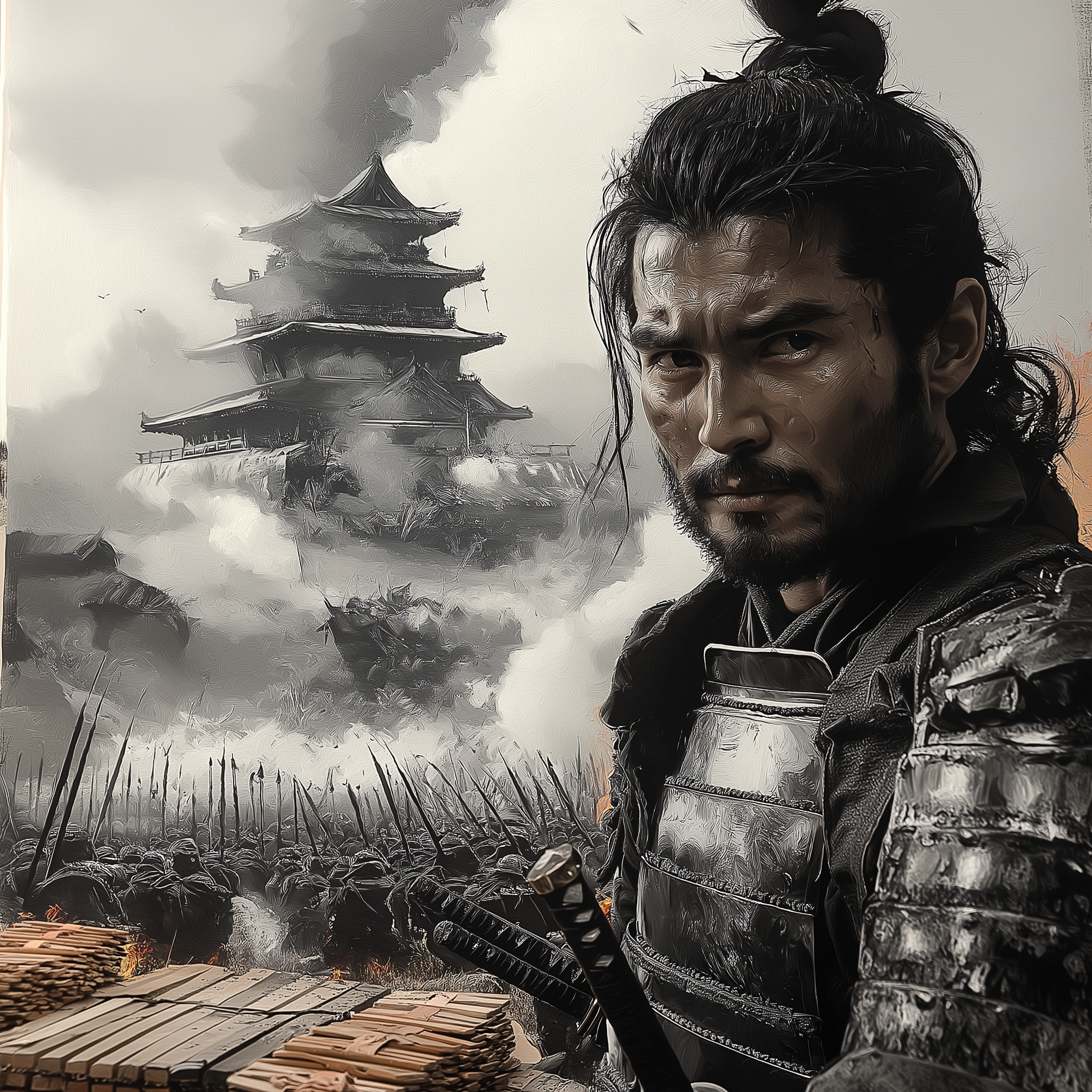 This image showcases a striking close-up of a samurai warrior depicted in a realistic style. The contrast of black on white emphasizes the intensity and drama of the battlefield, capturing the essence of strength and honor.