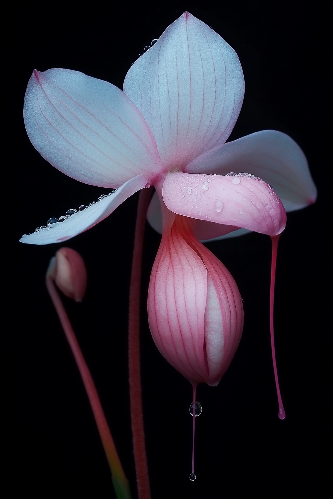 The image features a striking sandhill crane elegantly posed with a magenta orchid, all set against a deep black background. The minimalist style emphasizes the beauty of the subjects, creating a serene and artistic atmosphere.