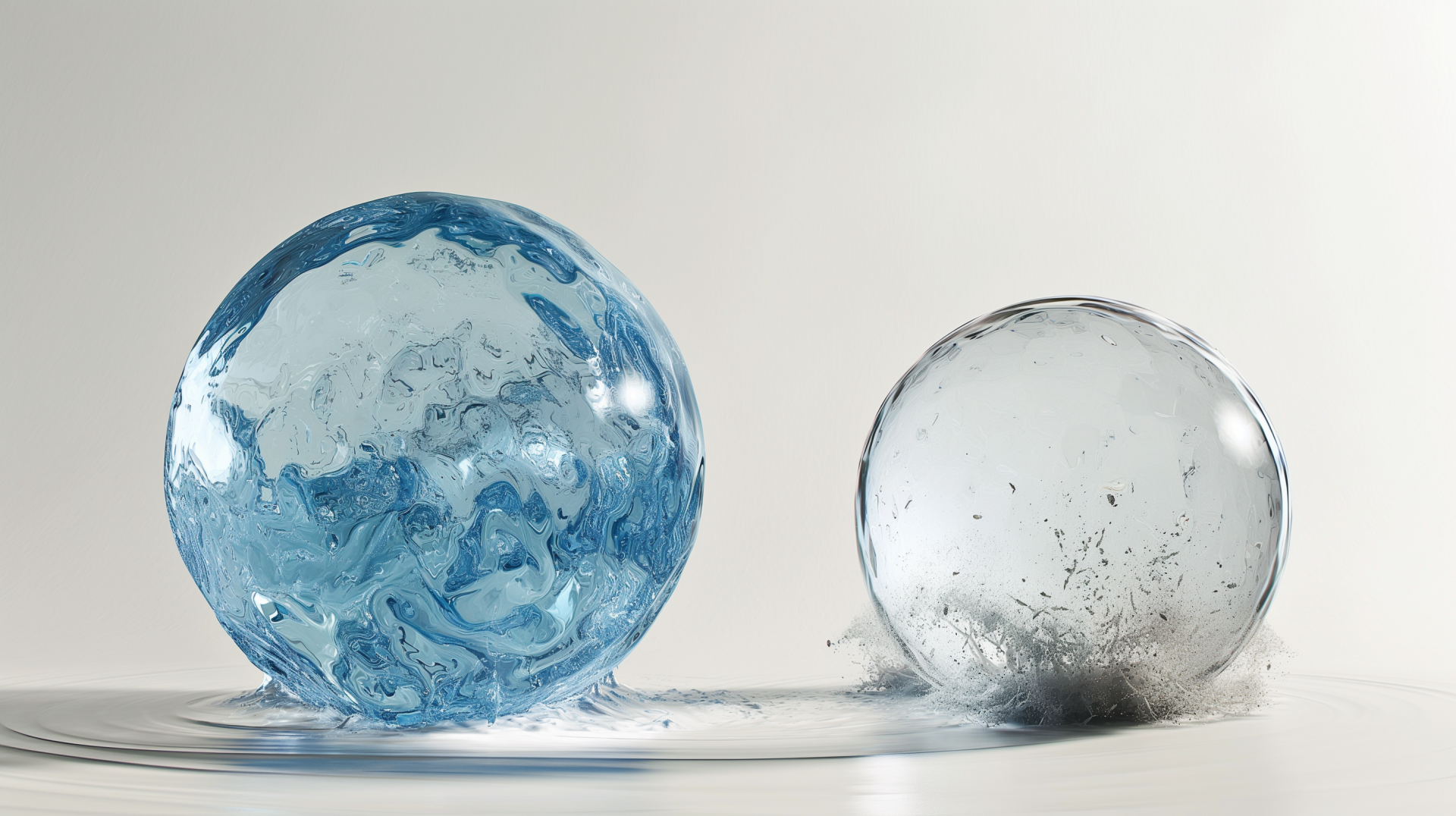 This image features two distinct spheres made of water, one large and clear, while the other is smaller and murky. Set against a light background, the contrasting appearances emphasize the purity and impurity of the water.