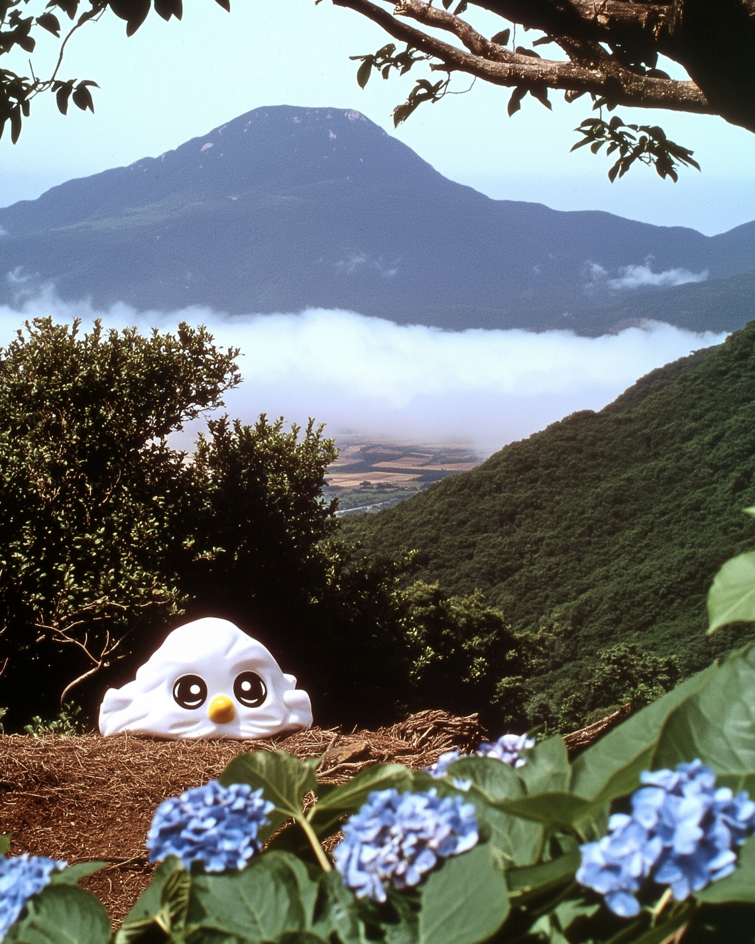 The image captures a surreal landscape enveloped in large pink fog, surrounding a unique white shiny rock with cartoon eyes. In the foreground, there are blurred tree branches adorned with vibrant blue and purple flowers, enhancing the dreamlike atmosphere.