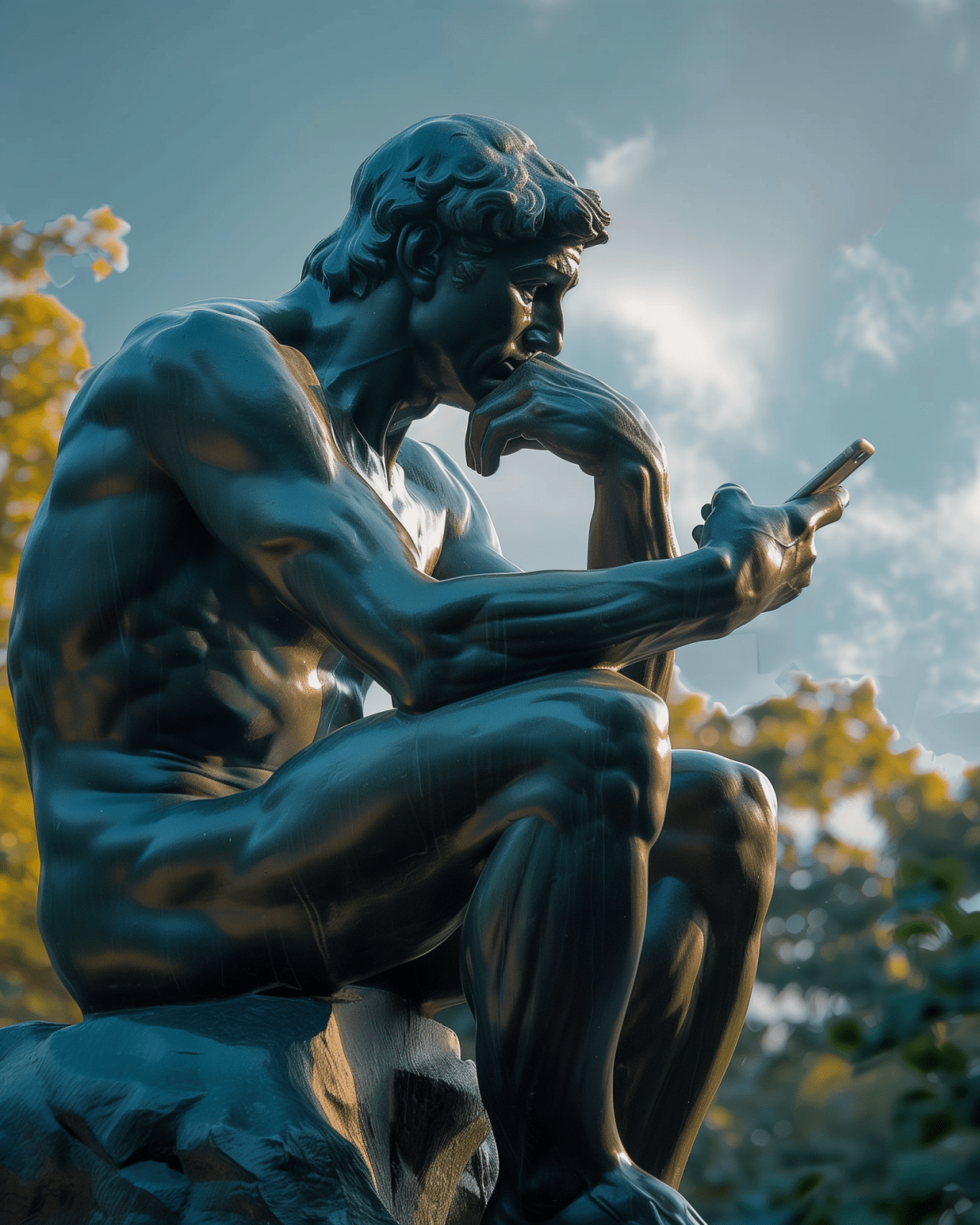 The image features Rodin's Thinker sculpture holding an iPhone in a serene garden setting. The lush greenery and historical architecture of the Musée Rodin create a juxtaposition between classical art and modern technology.