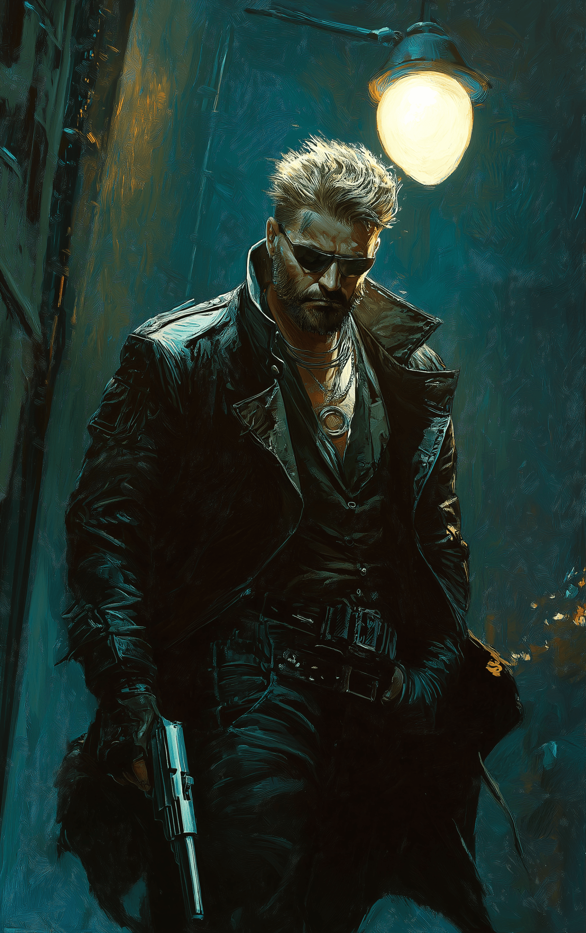 This vibrant cyberpunk illustration features a rugged man with striking olive skin and bleached blond hair, dressed in a sleek trench coat. The atmosphere is intense and futuristic, with bright neon lights illuminating his powerful stance as he wields a high-tech weapon.