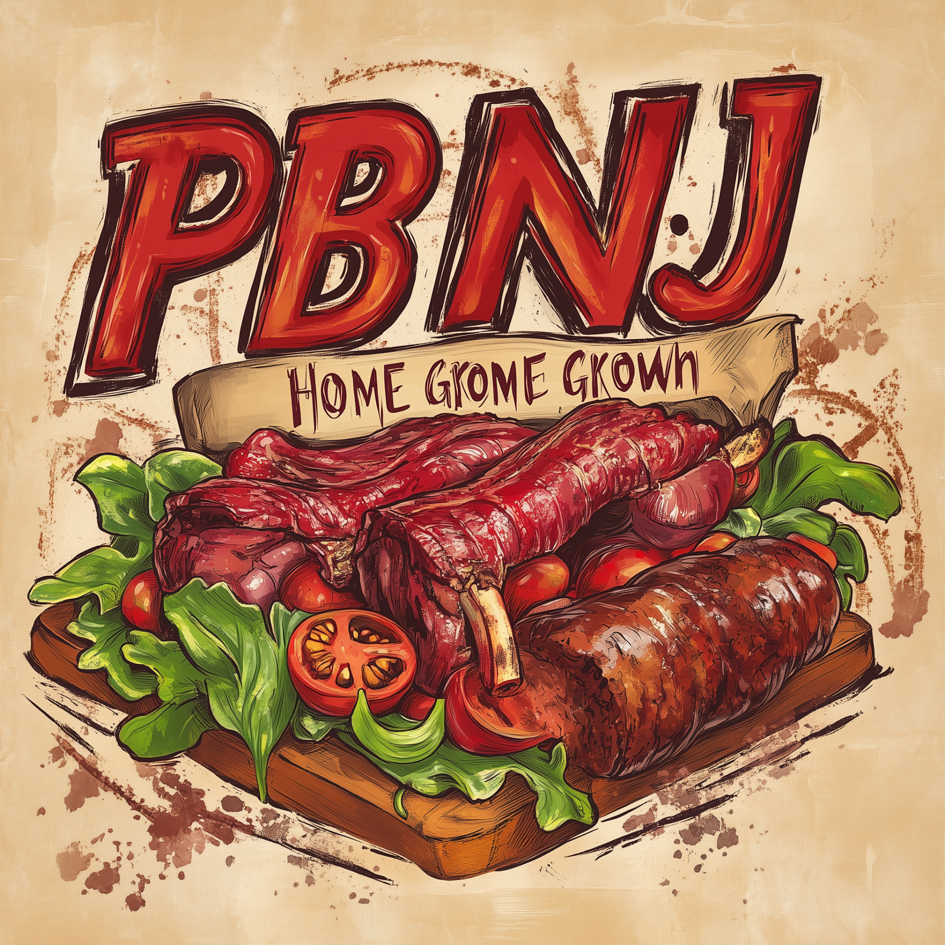 This image features a vibrant logo design for a barbecue brand, showcasing rustic elements and a warm color palette. The text 'PBNJ Home Grown' is prominently displayed, creating a welcoming and homely feel.