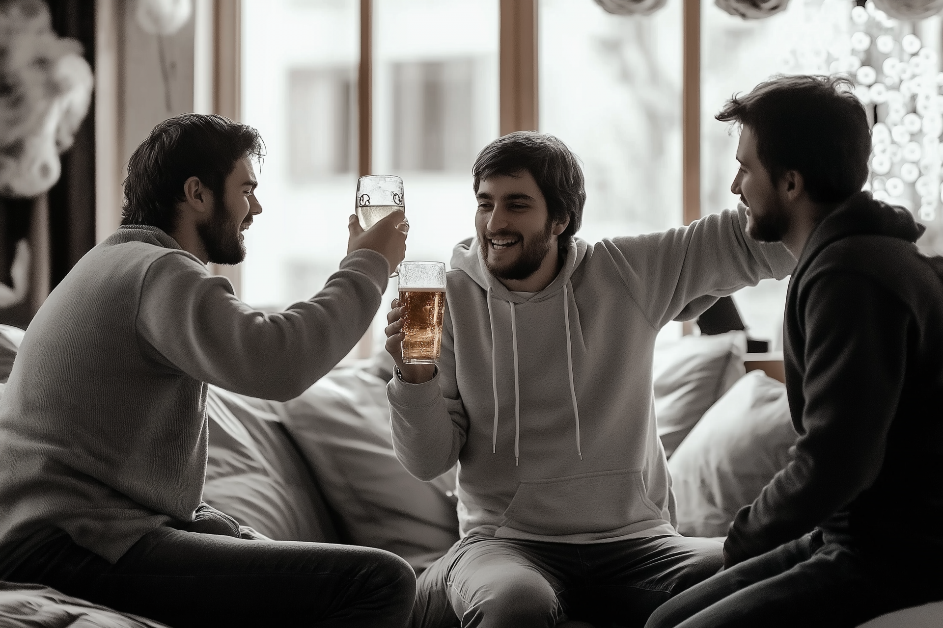 The image captures a lively atmosphere as a group of men enjoy a beer together, sharing laughter and camaraderie. The setting is casual, with warm lighting that enhances the friendly vibe of the gathering.