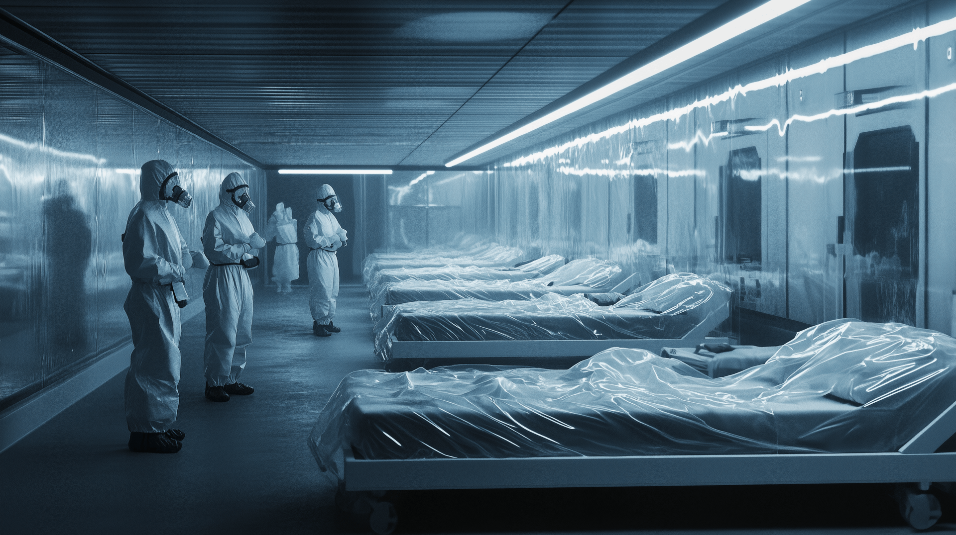 This image portrays a photorealistic cinematic shot of a medical team featuring doctors and nurses, all wearing masks. The setting is a sterile room designed for isolation, filled with multiple beds, each covered to emphasize the seriousness of the environment.