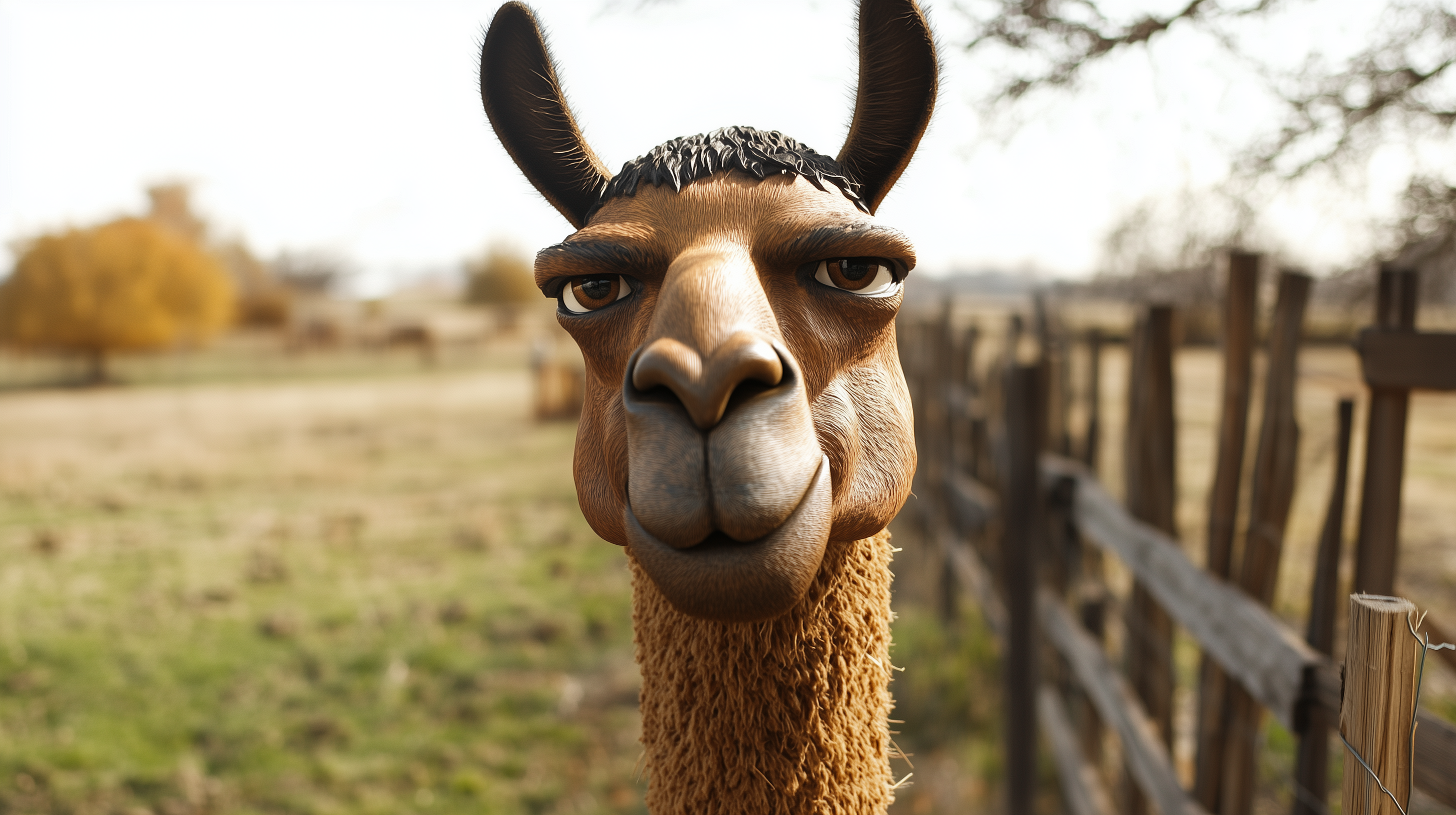 This whimsical illustration features a llama adorned with a playful rendition of a familiar face. Set against a grassy field and wooden fence, the scene is bright and cheerful, capturing a lighthearted atmosphere.