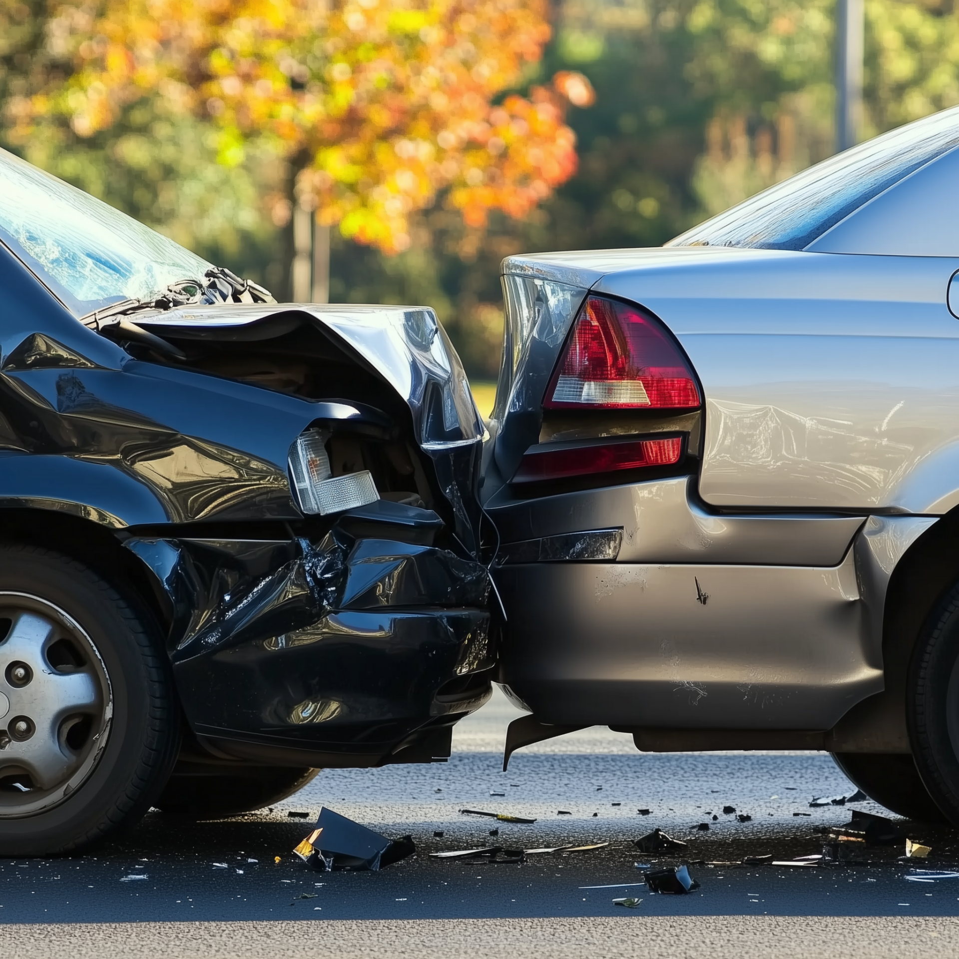 The image depicts two vehicles, a black car and a silver SUV, facing each other after a collision. Both cars show visible damage on their front ends, set against a sunny outdoor backdrop.