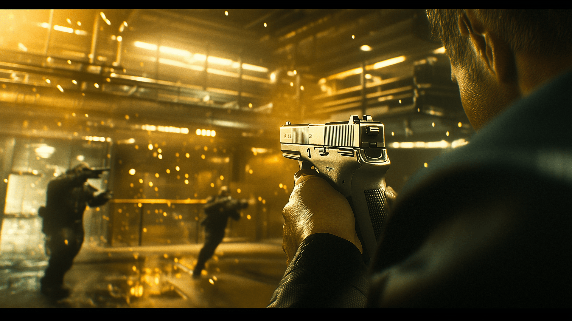 The image depicts a tense scene featuring a man armed with a silver Glock pistol, poised and powerful. The ambiance echoes that of an action movie, filled with suspense and intensity.