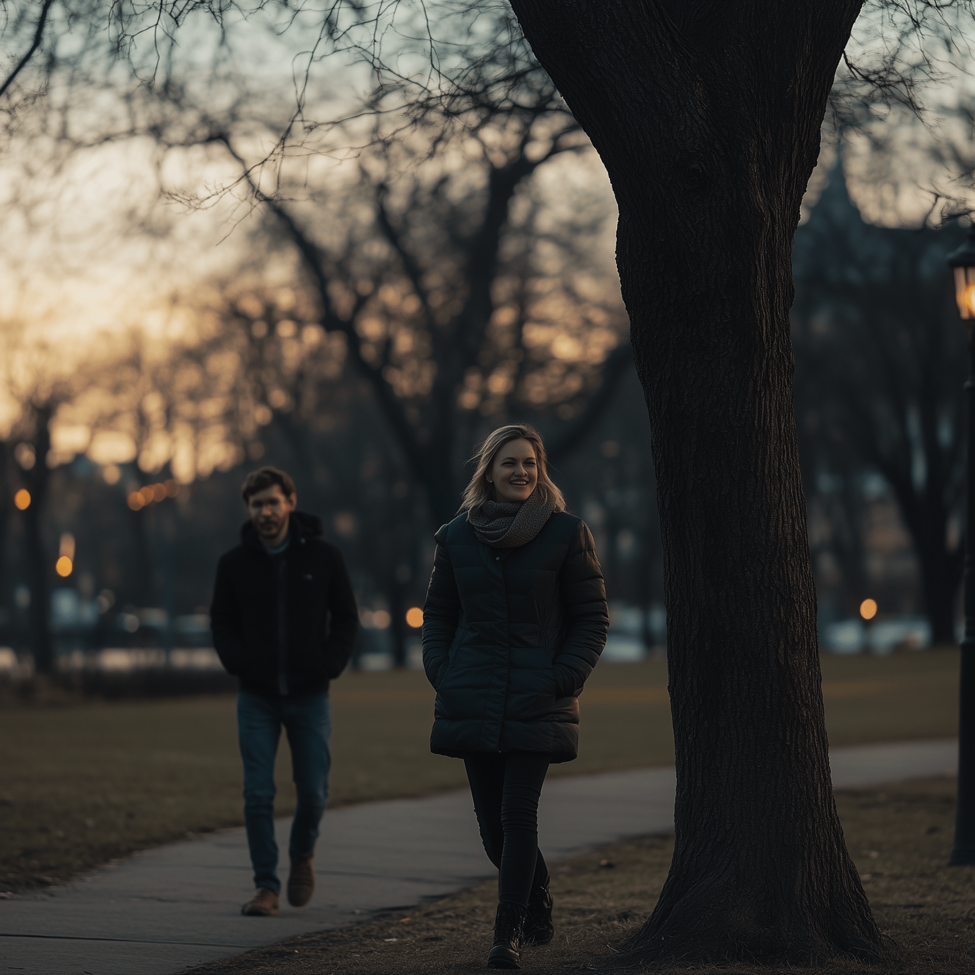 The image captures a serene park scene during the evening. A woman and a man walk together, smiling, while a lone man observes from a distance, hinting at his emotional turmoil.