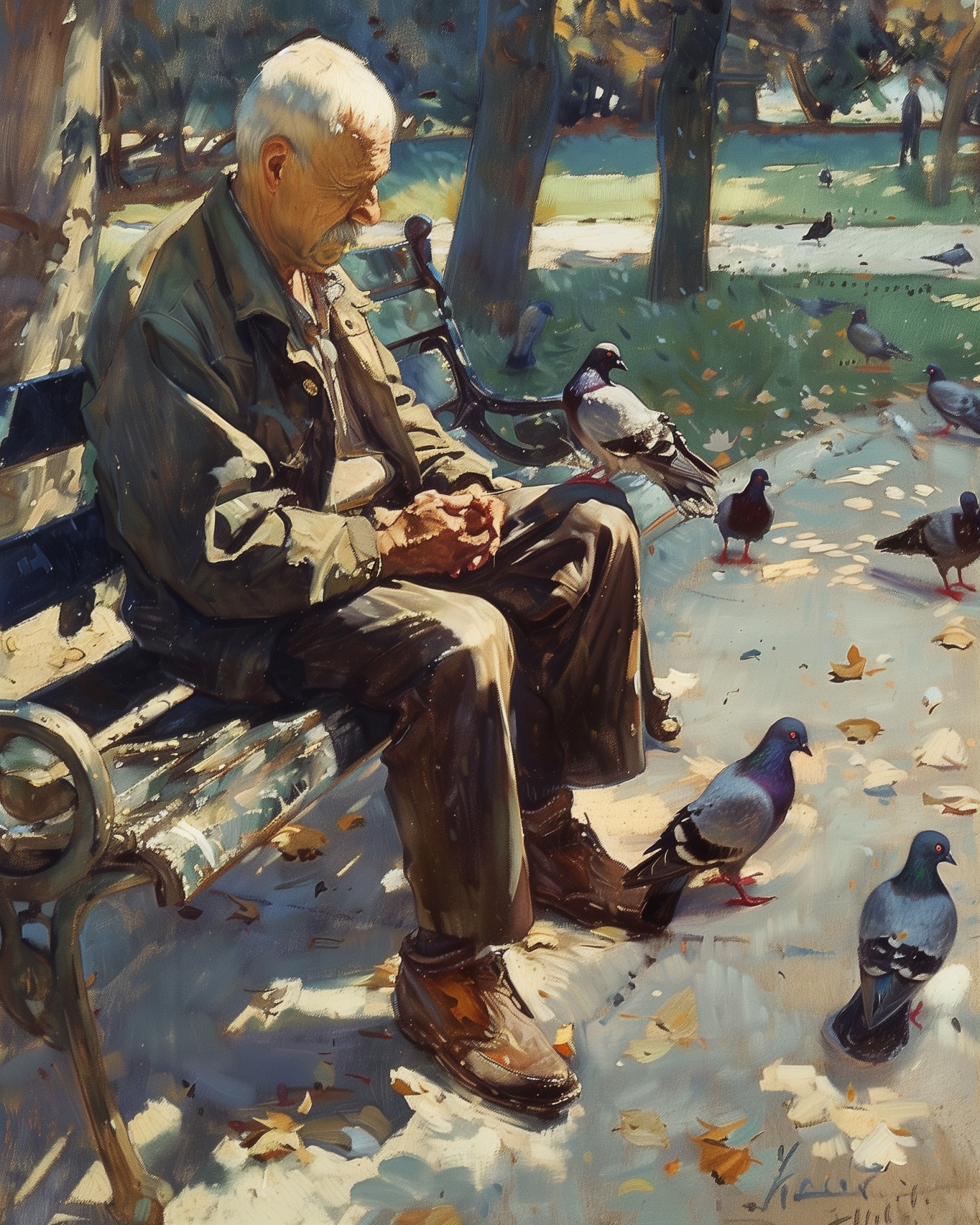 The image captures a close-up of an elderly man sitting serenely on a park bench amidst a tranquil setting. He appears absorbed in the simple act of feeding pigeons that gather around him, evoking feelings of peace and solitude.