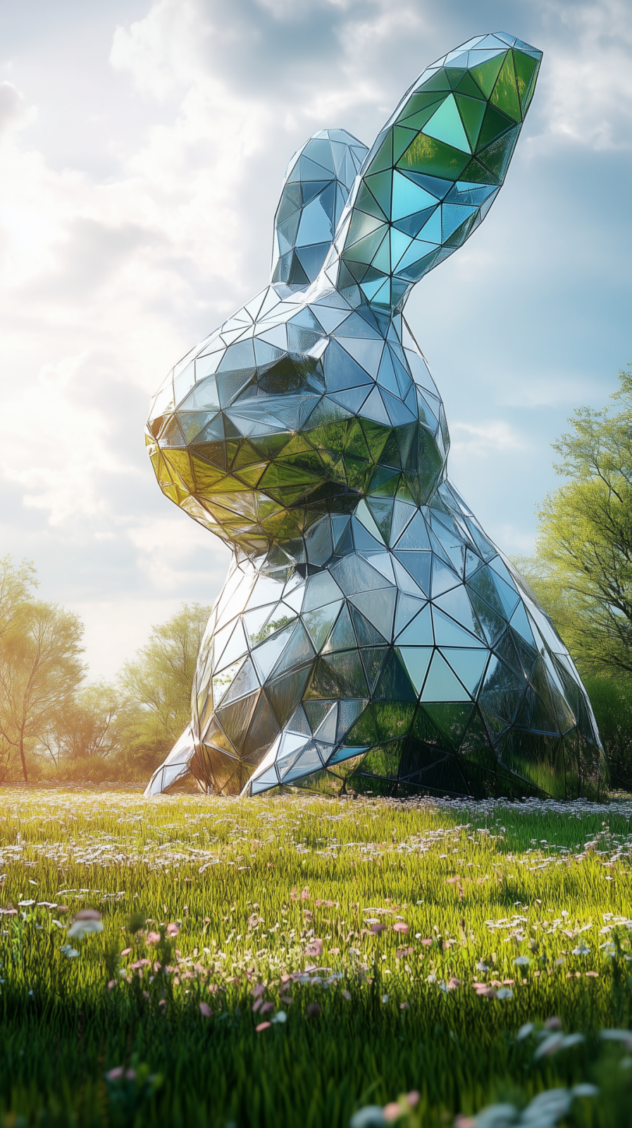 The image depicts a photorealistic futuristic glass building shaped like a giant rabbit, featuring a regular triangular parametric pattern. It sits amidst a lush springtime grass field under nice weather, offering a breathtaking landscape view.
