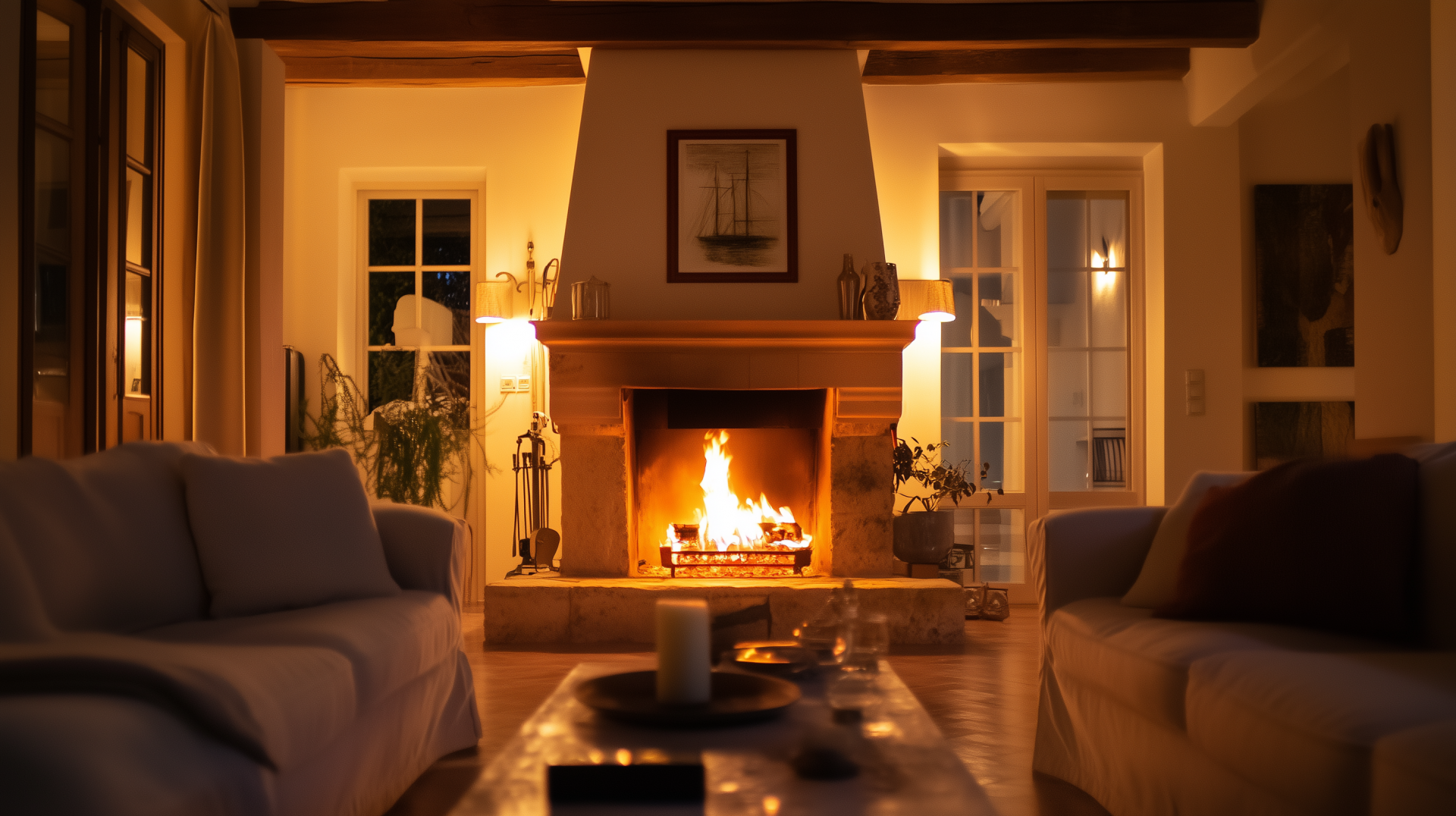 The image captures a warm and inviting gas fire burning brightly inside a fireplace. The living room exudes a charming ambiance, highlighting the elegance of the Cypriot villa.