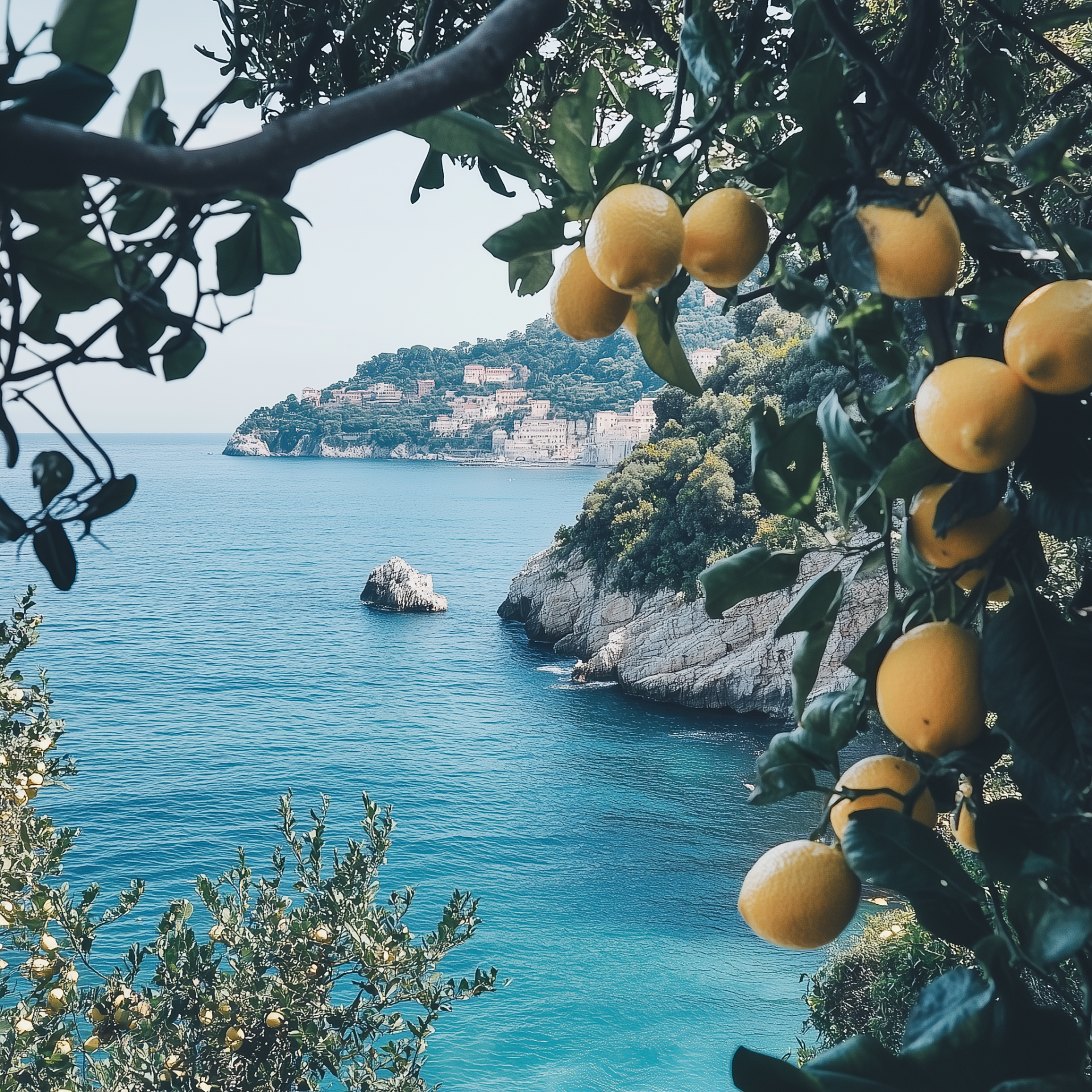 This photograph captures a breathtaking view of the Italian coastline, dotted with vibrant lemon trees. The scene evokes a sense of tranquility as the azure ocean meets the rugged cliffs under a clear sky.