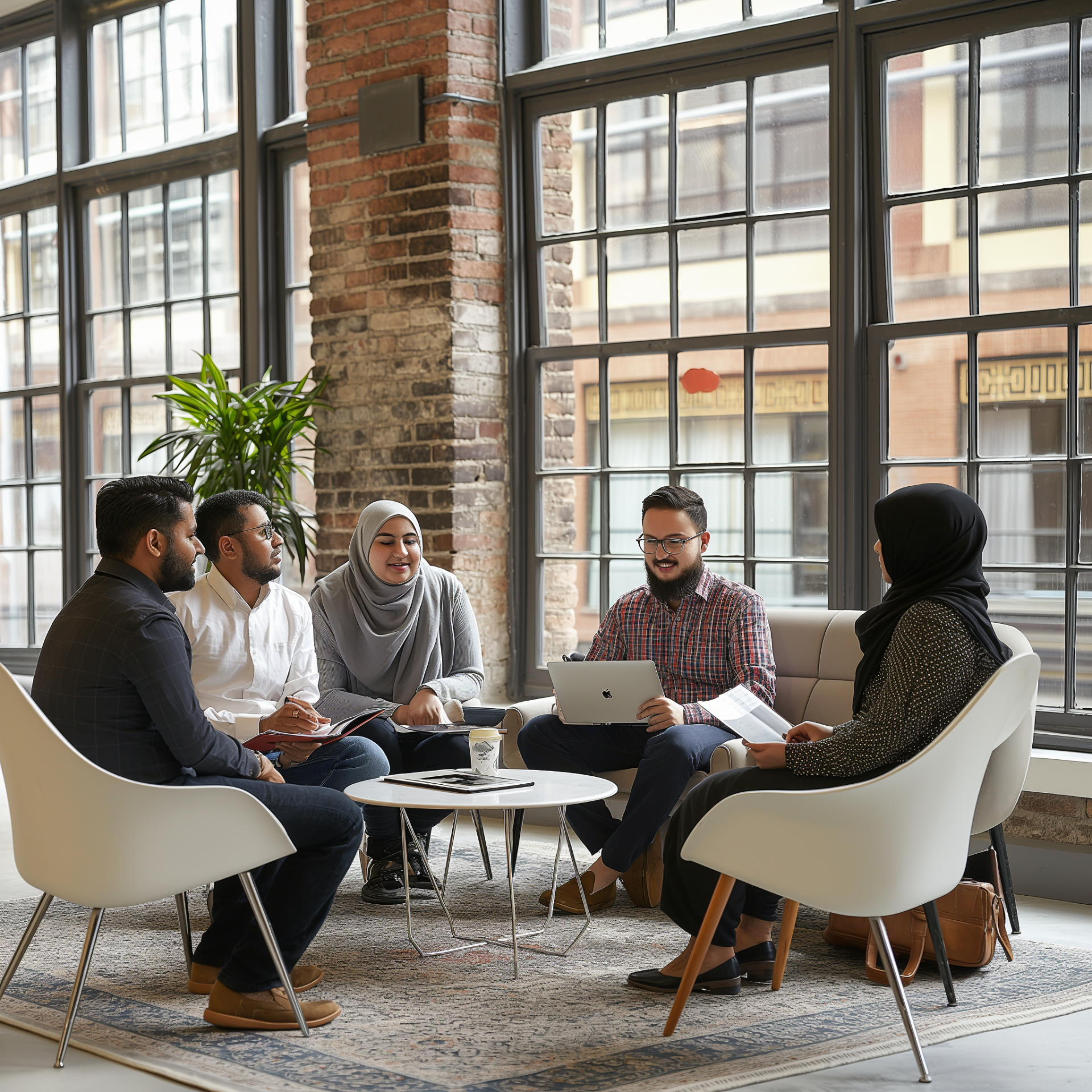 The image shows a professional meeting environment featuring men and Muslim women engaged in discussion. The atmosphere is casual yet focused, highlighting collaboration and inclusivity.