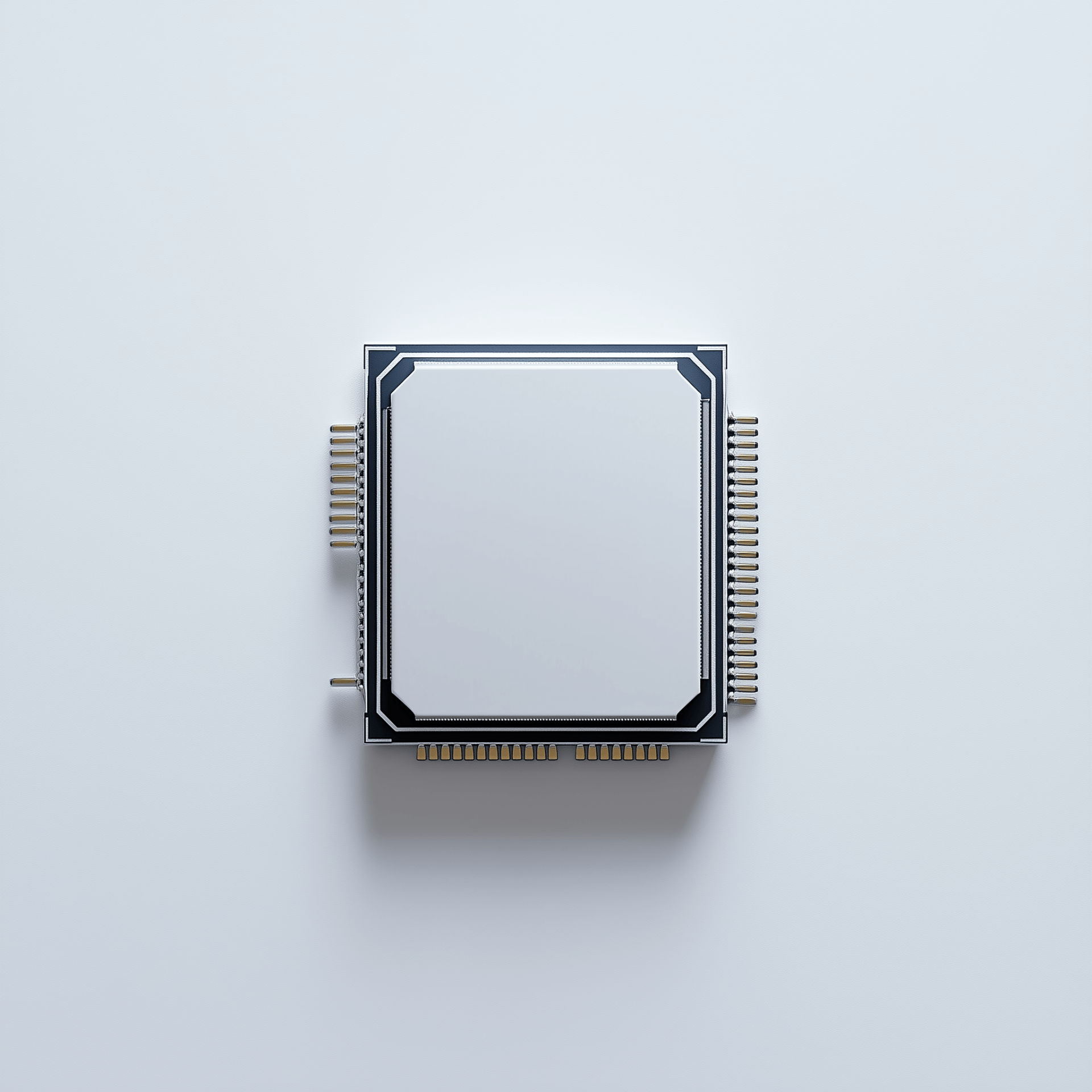 The image showcases a microchip placed on a pristine white desk, shot from a top-down perspective. The minimalistic style emphasizes the sharp features of the chip against a bright, uncluttered background illuminated by studio lighting.