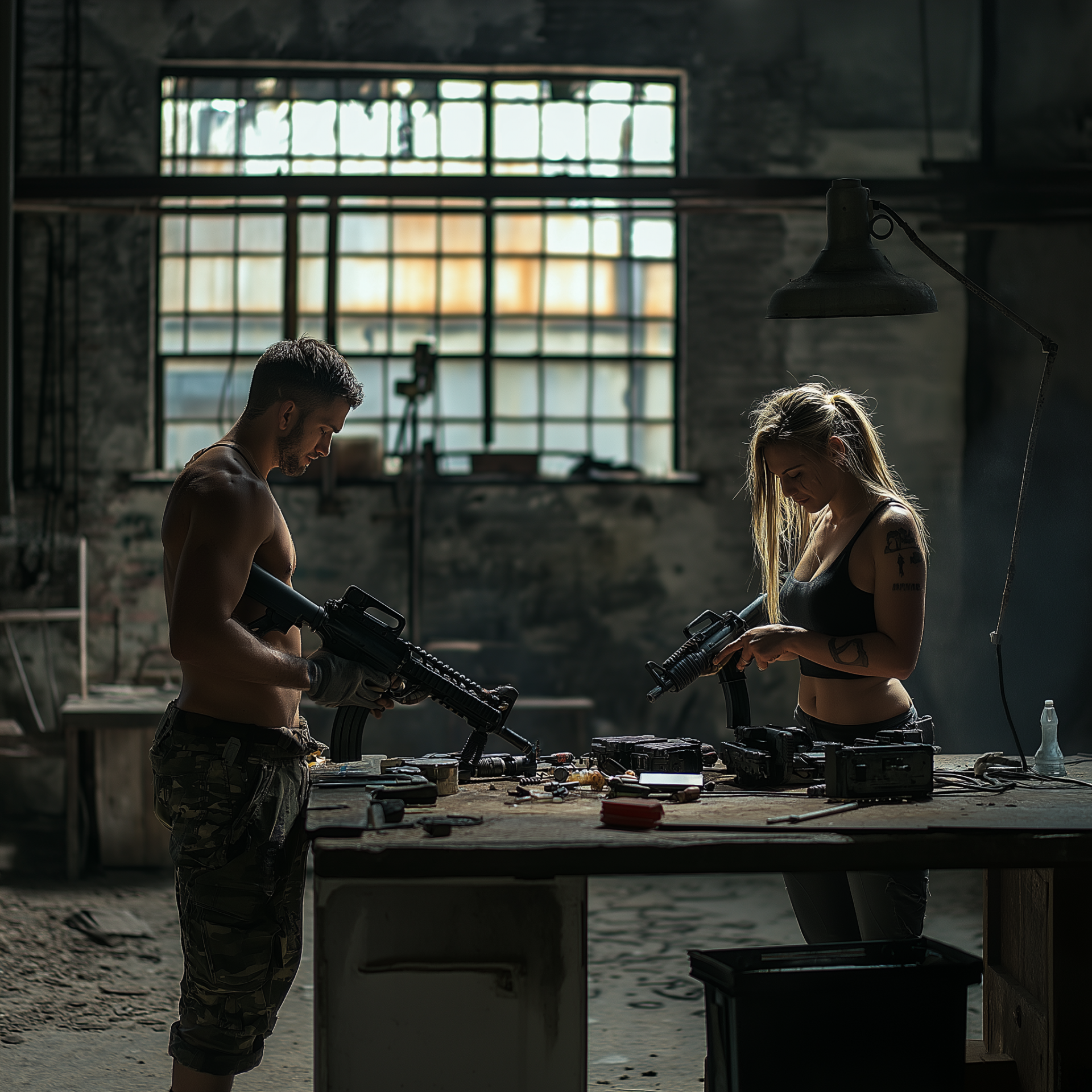 The image depicts a desolate warehouse setting with a post-apocalyptic vibe. A man and a woman are focused on cleaning their firearms amidst the crumbling surroundings, highlighting a sense of survival and preparation.