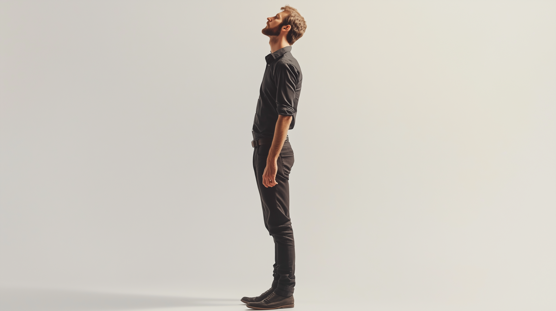 The image features a tall man standing and looking up, captured in a full-body view. It evokes a nostalgic feel reminiscent of 1980s advertisements with its realistic portrayal and vintage style.