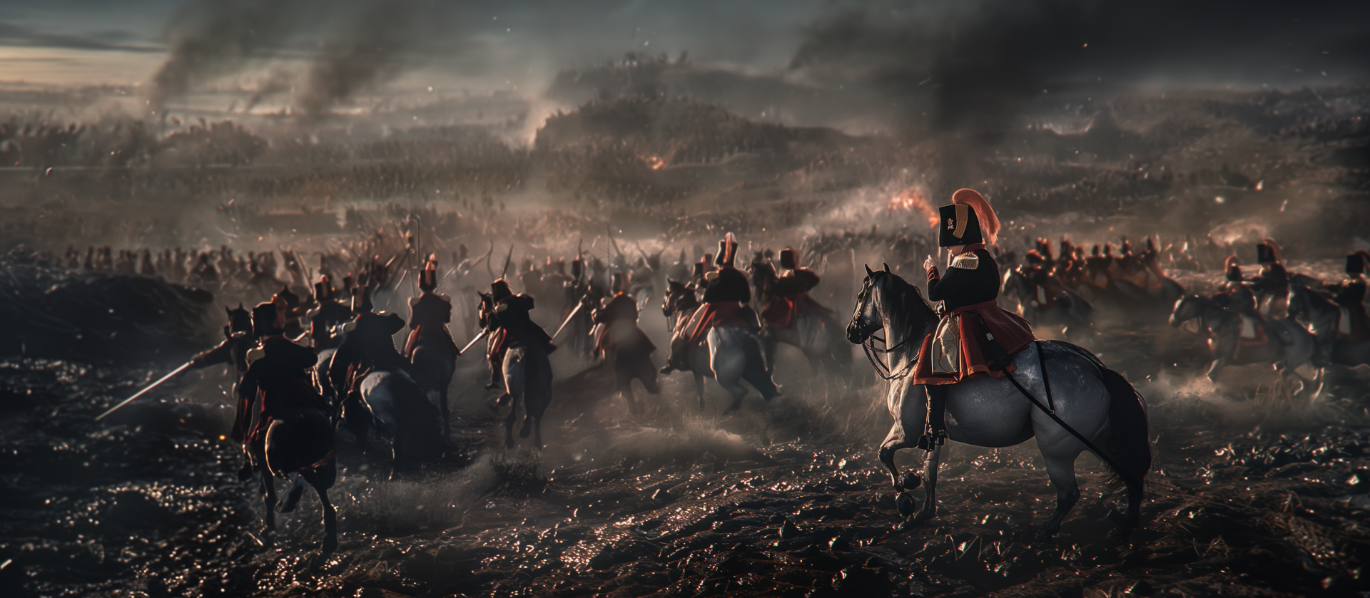 This dramatic image captures Napoleon Bonaparte commanding his troops on horseback amidst the chaos of battle. The photo is characterized by its high contrast and intricate detailing, evoking a sense of historical grandeur and intensity.