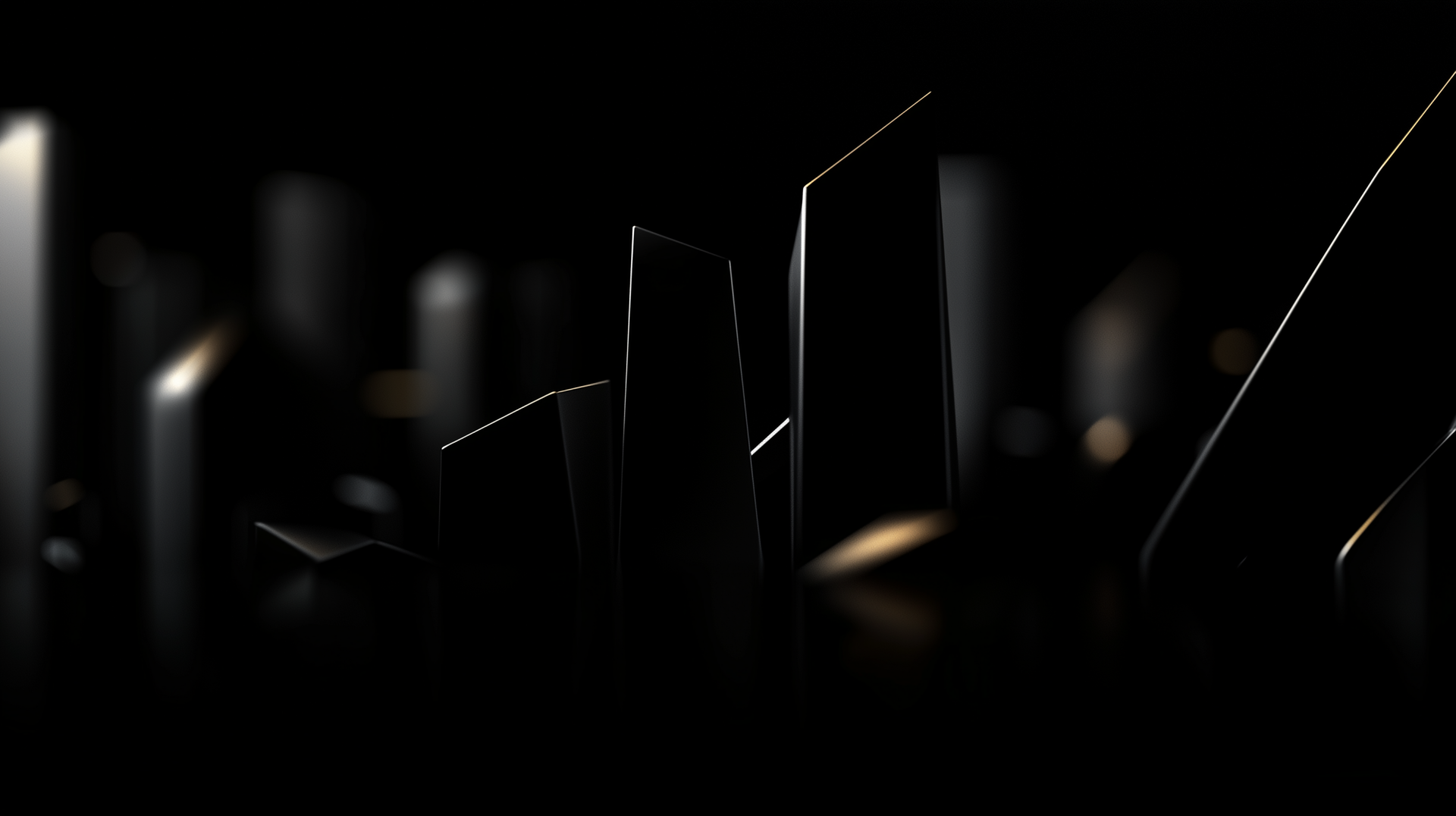 The image showcases photorealistic sleek buildings emerging against a solid black background, creating striking silhouettes. The minimal lighting enhances the dramatic contrast and adds depth to the scene.