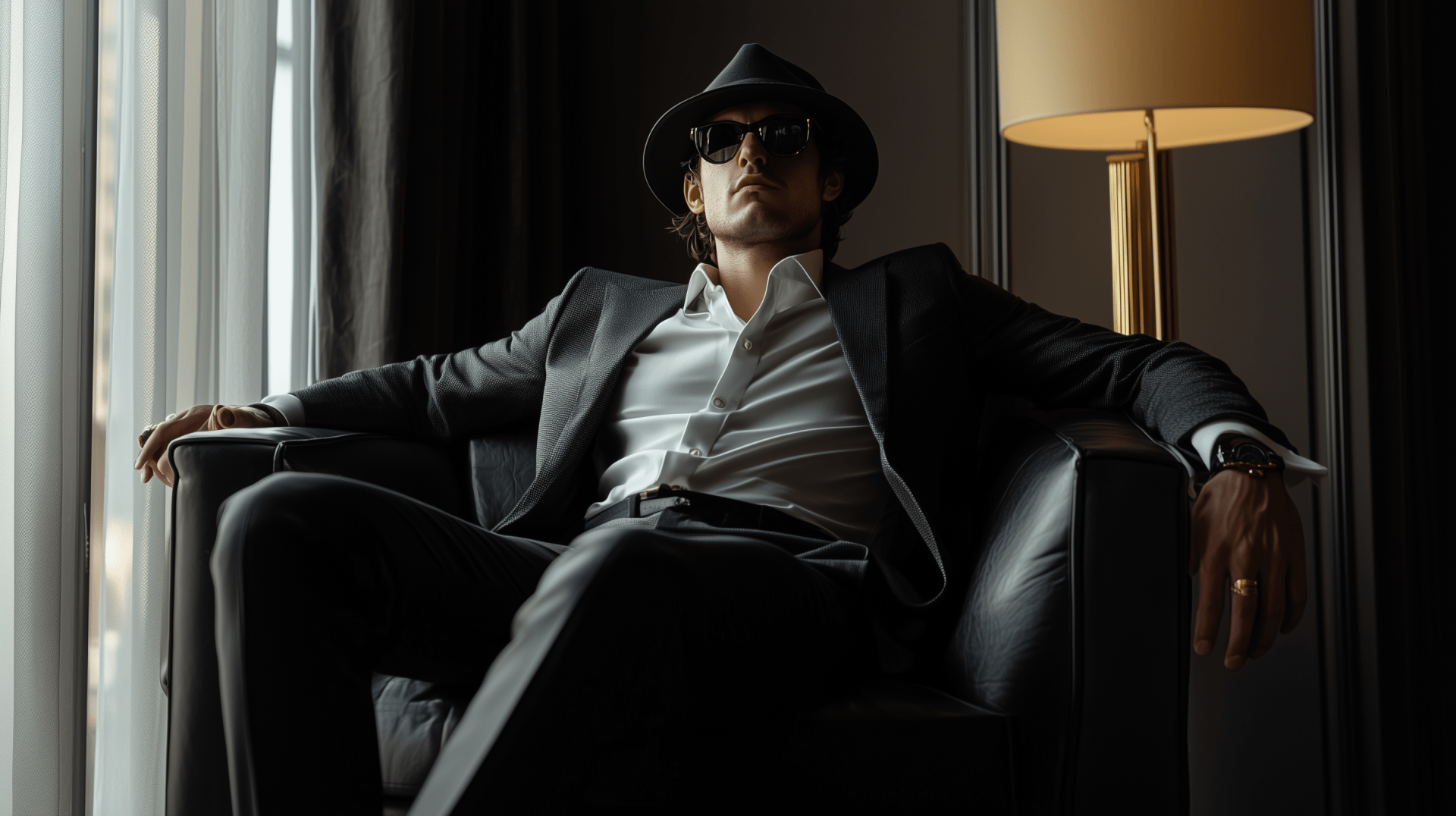 The image features a wealthy-looking man exuding confidence and authority in a luxurious environment. His expression and posture suggest he commands the attention of the room, creating a striking presence with an ultra-realistic finish.