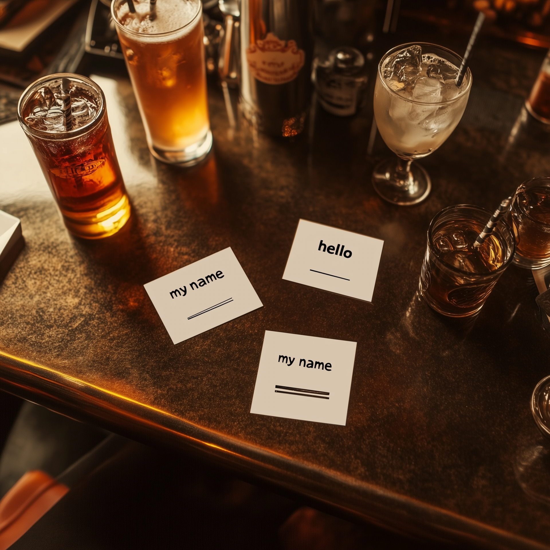 This image shows a top-down view of a bar table arrangement. It features blank name tags and drinks, creating a welcoming and casual atmosphere.