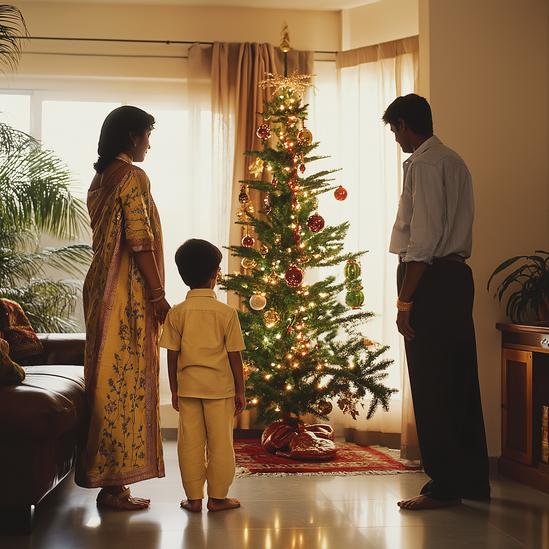 The image captures a warm moment of a young boy with his parents, all gazing at a beautifully decorated Christmas tree in their cozy living room. The atmosphere is filled with joy and anticipation, reflecting a festive family celebration.