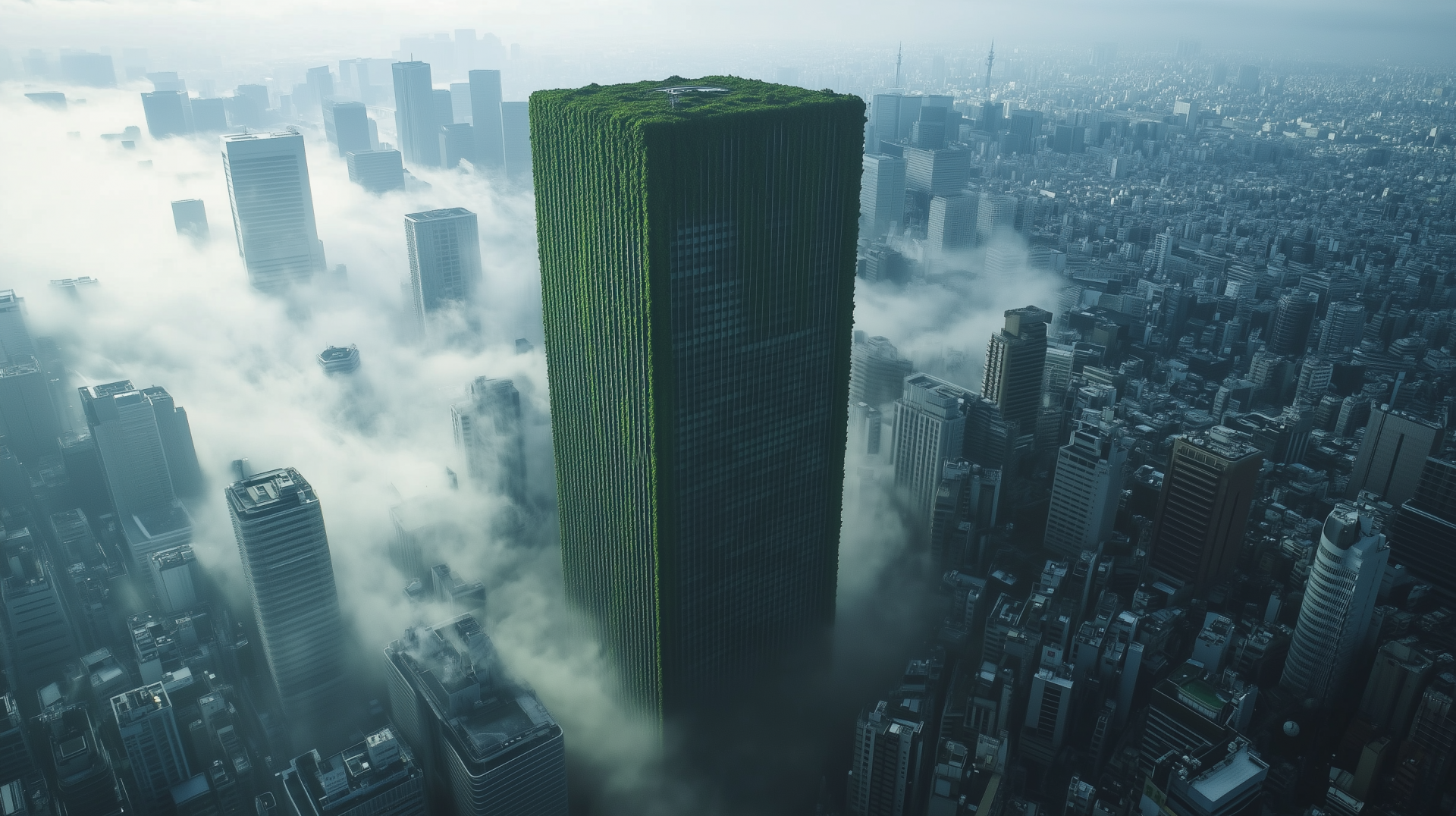 A stunning photo of a towering skyscraper surrounded by a cityscape filled with other buildings. The once modern structure is now enveloped in lush green moss, creating a fascinating contrast between nature and urban architecture.
