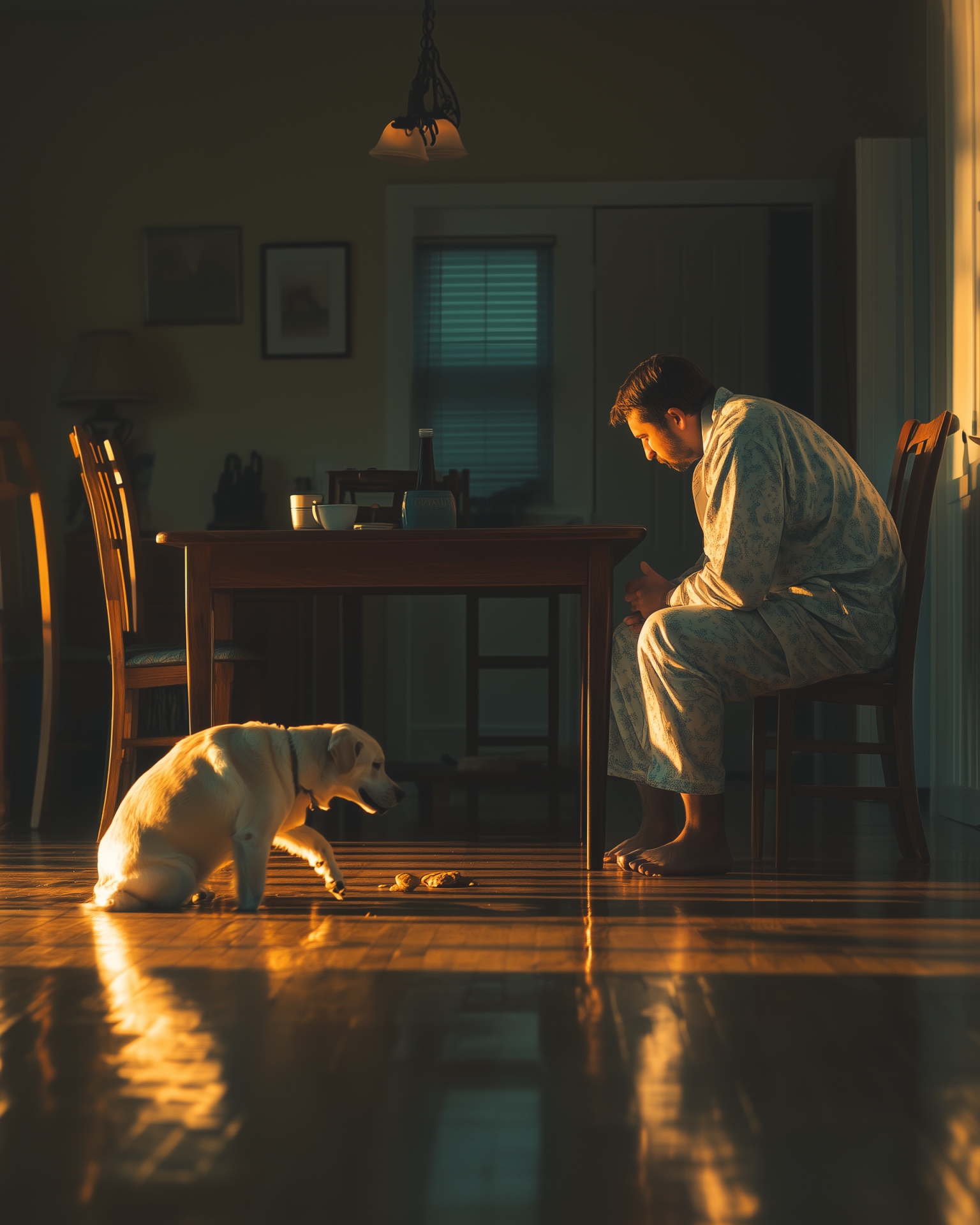 This photo captures a cozy dining room scene filled with natural daylight. A relaxed man in pajamas chats at the table while a cheerful Labrador retriever eagerly enjoys a treat from the floor.