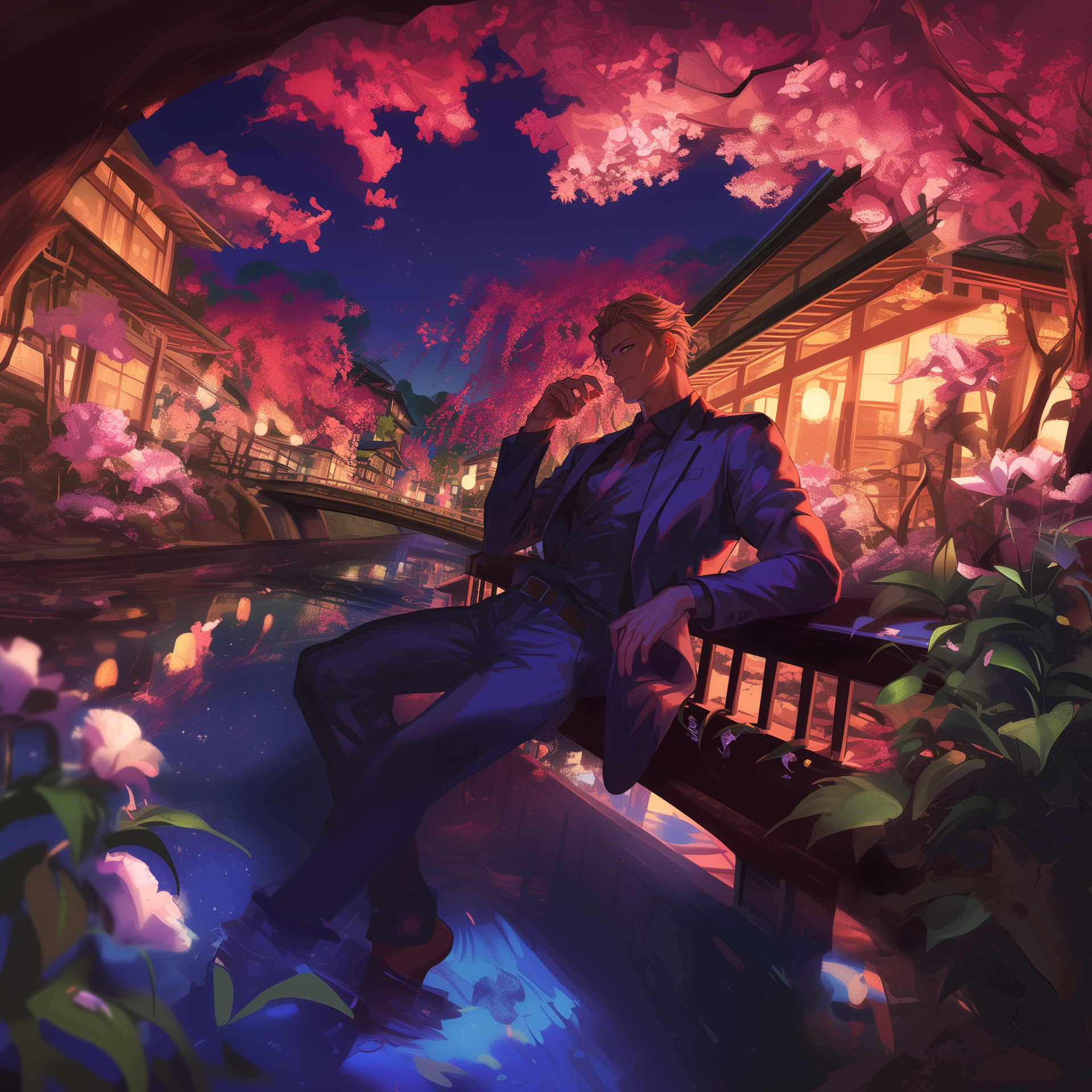The image captures a serene scene of a figure enjoying the tranquility of a garden bridge under the night sky. Soft moonlight casts gentle shadows, highlighting the beauty of the surrounding nature.