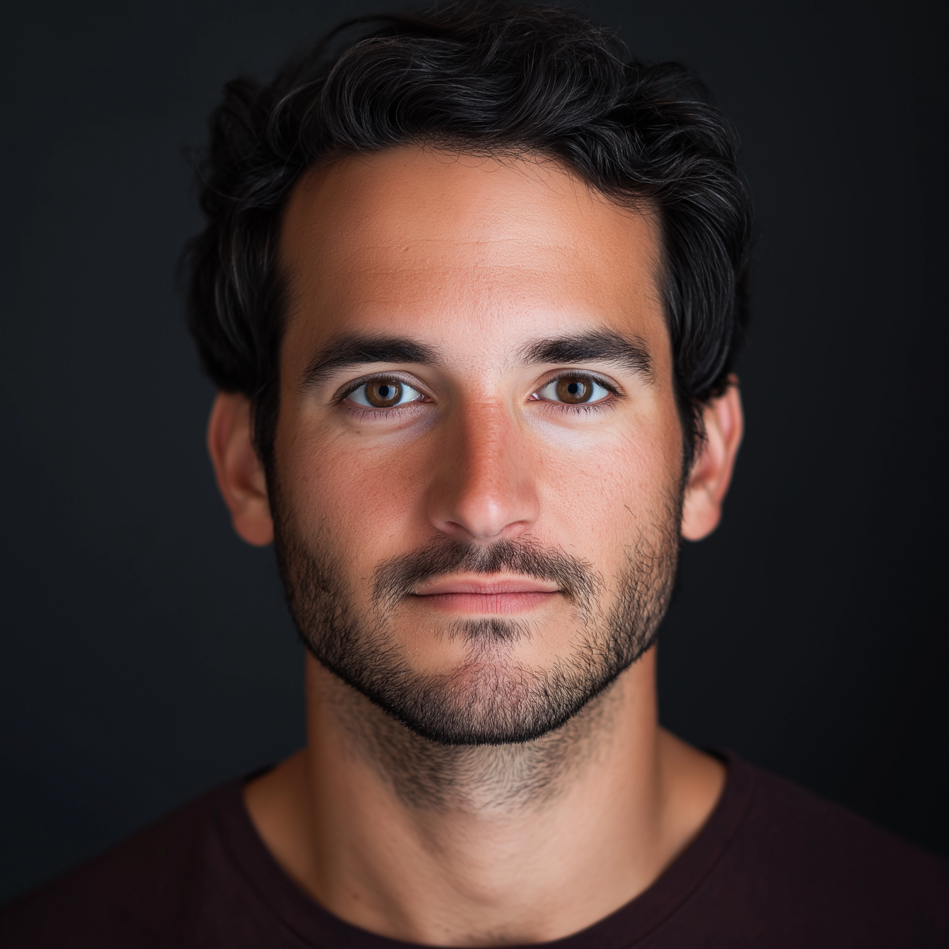 The image shows a direct front facing headshot of a man with an even skin tone and no facial hair. The lighting is soft and uniform, creating a clean and minimalist appearance against a blank background.