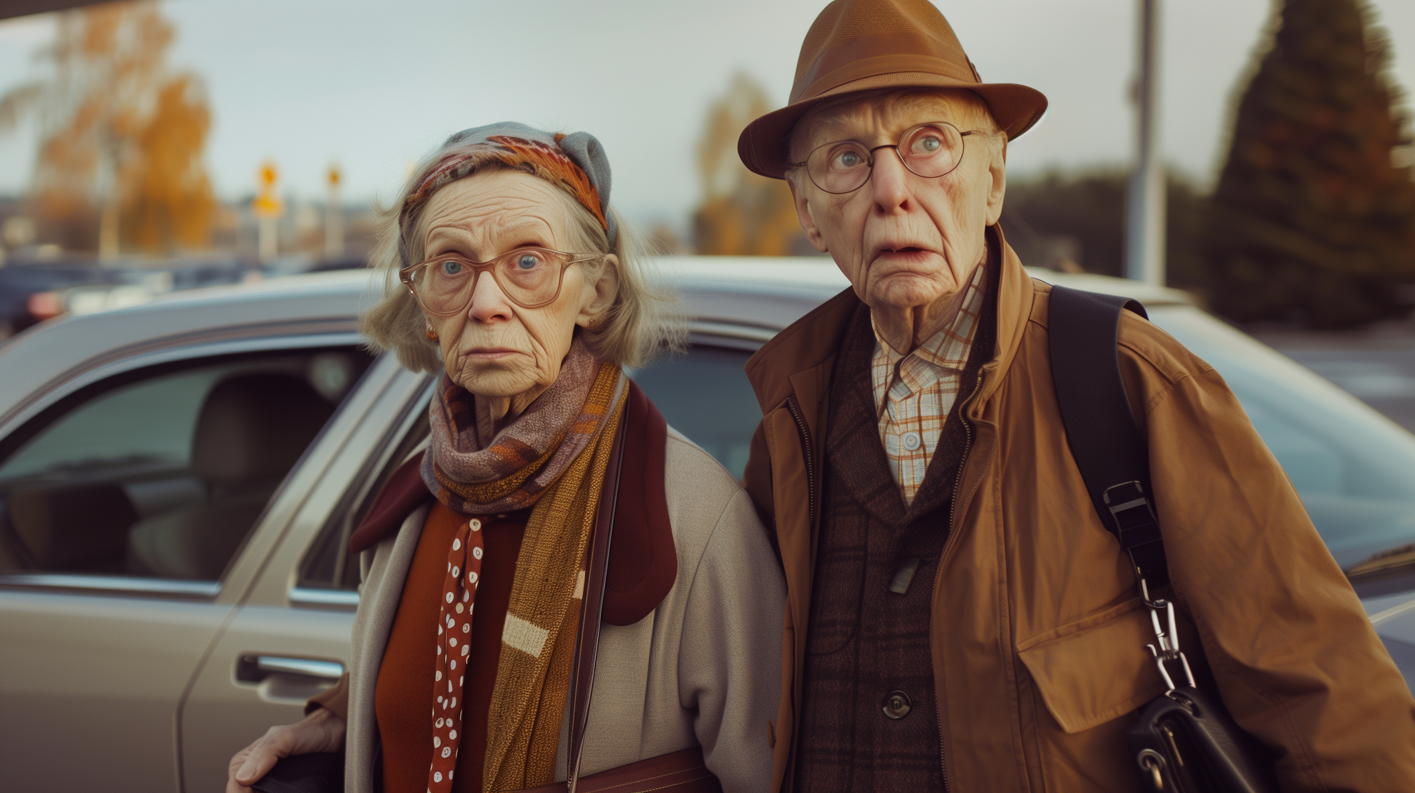 This photograph captures an elderly couple arriving at a parking lot, their expressions reflecting uncertainty and nervousness. Natural daylight enhances the gentle shadows and realistic textures of their clothing and facial lines.