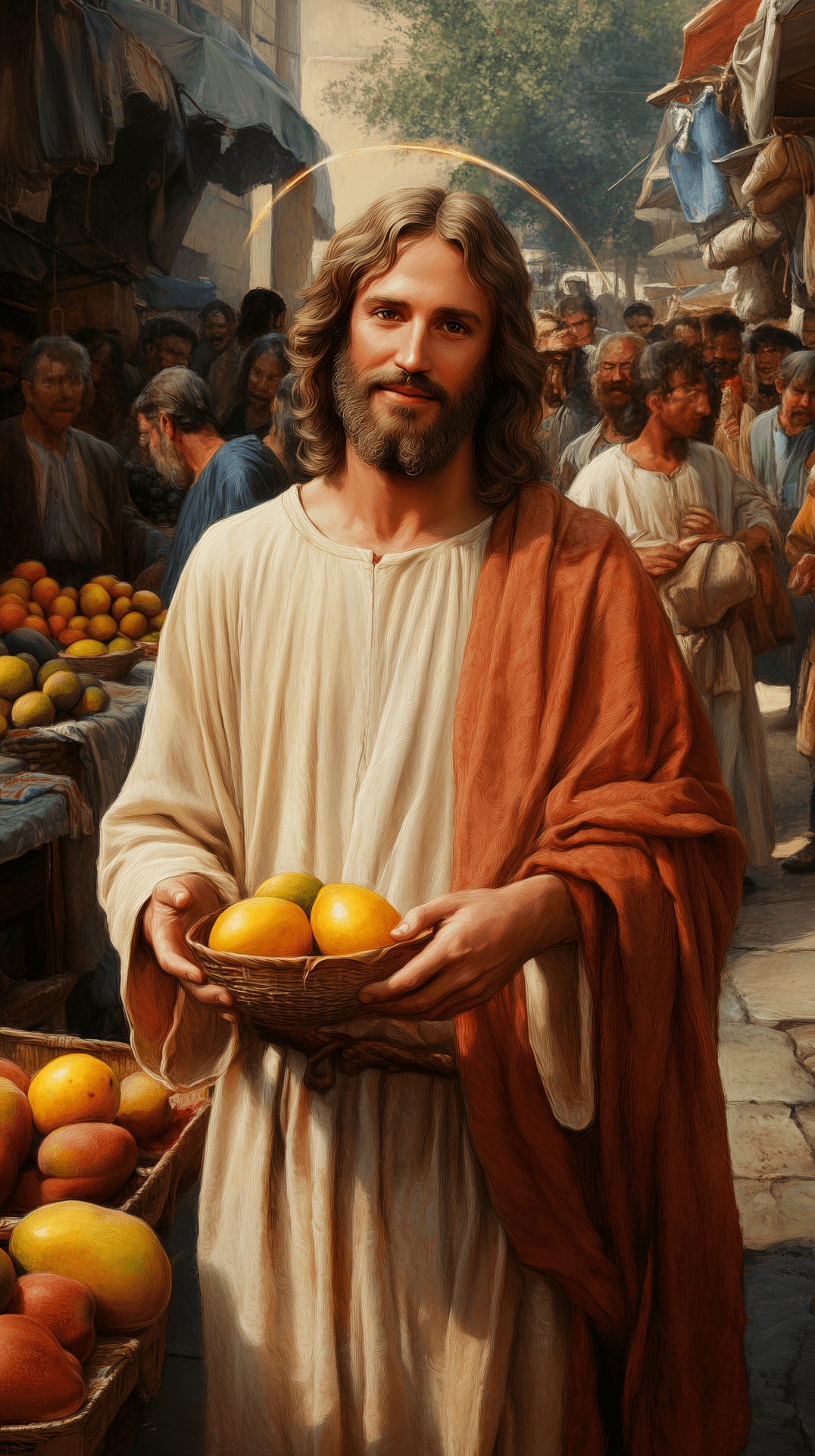 The image portrays a joyful figure of Jesus standing in a bustling market, capturing the essence of vibrant life around him. He is surrounded by people and a colorful array of fruits, showcasing an angelic presence amplified by his illuminated halo.