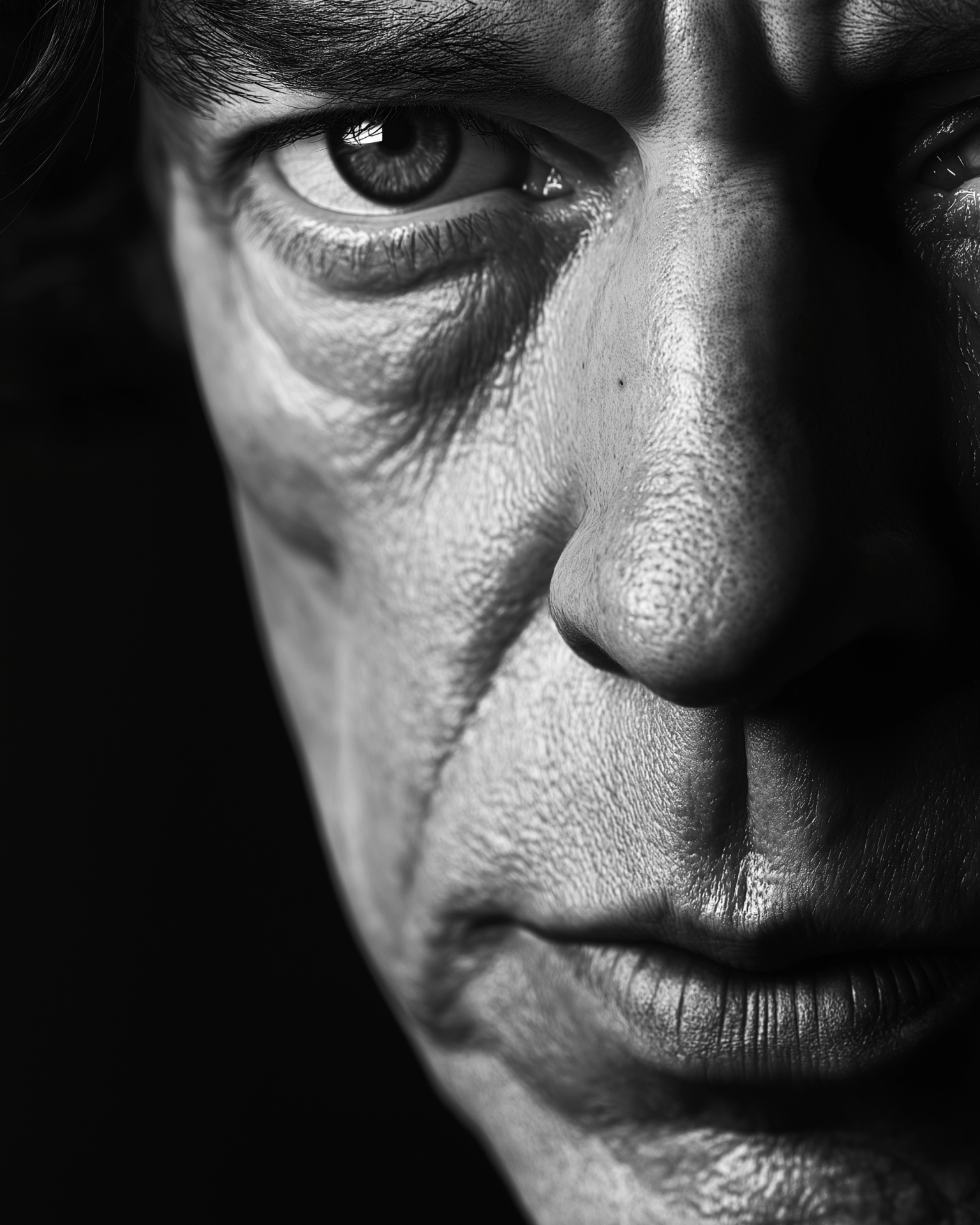This image captures a striking close-up of a male face in a photo-realistic black and white style. The warm and dark lighting highlights one side of the face, creating a dramatic effect.
