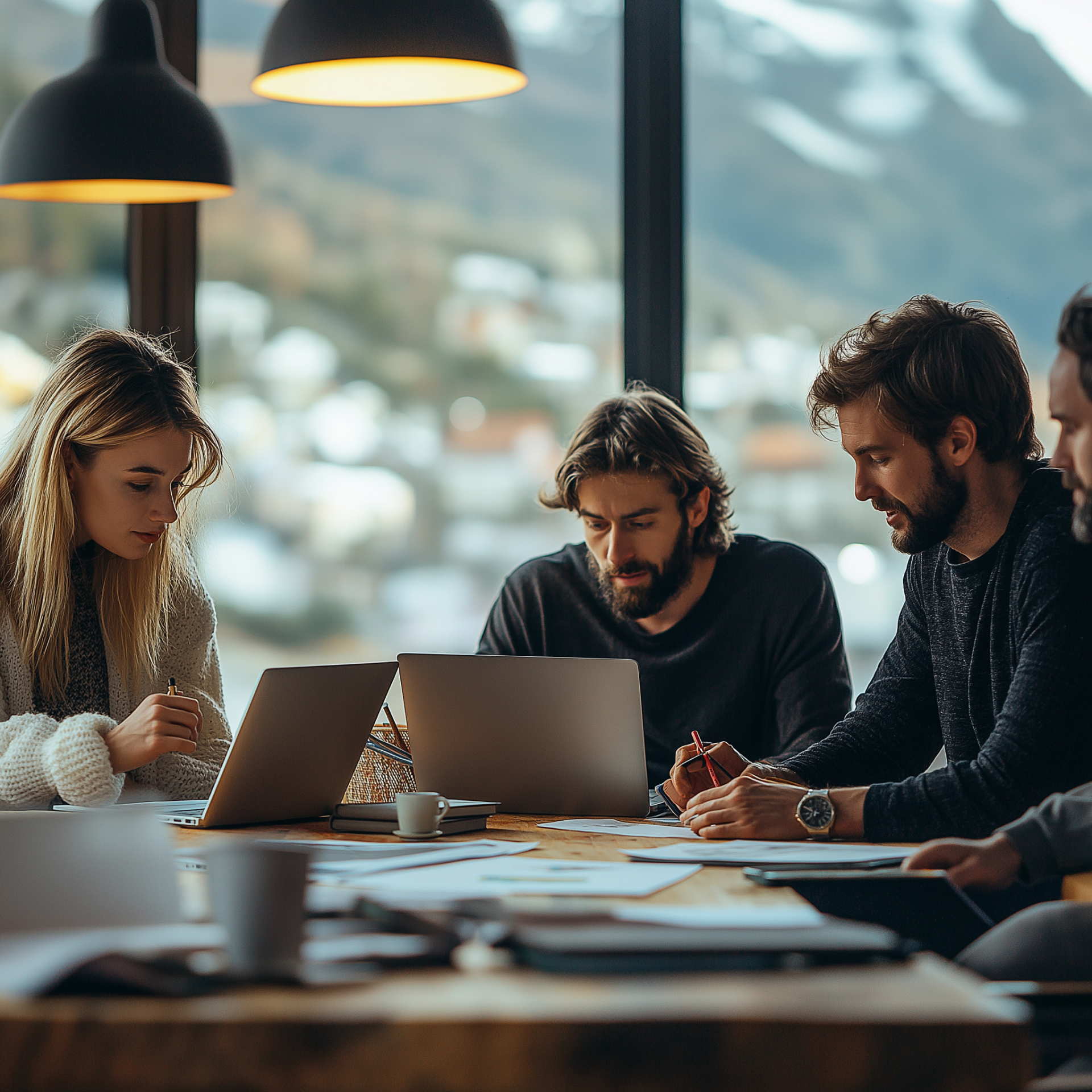 The image showcases a small team of professionals deeply engaged in a brainstorming session. The modern workspace features sleek furniture and bright lighting, creating an atmosphere of productivity and collaboration.
