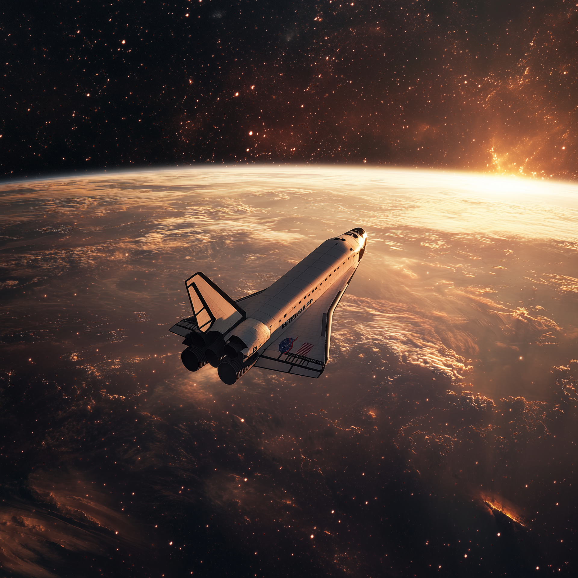 The image presents a hyper-realistic portrayal of a NASA space shuttle gracefully floating in the vastness of space. The light source from the right casts a striking glow, enhancing the shuttle's intricate details against the dark background of the cosmos.