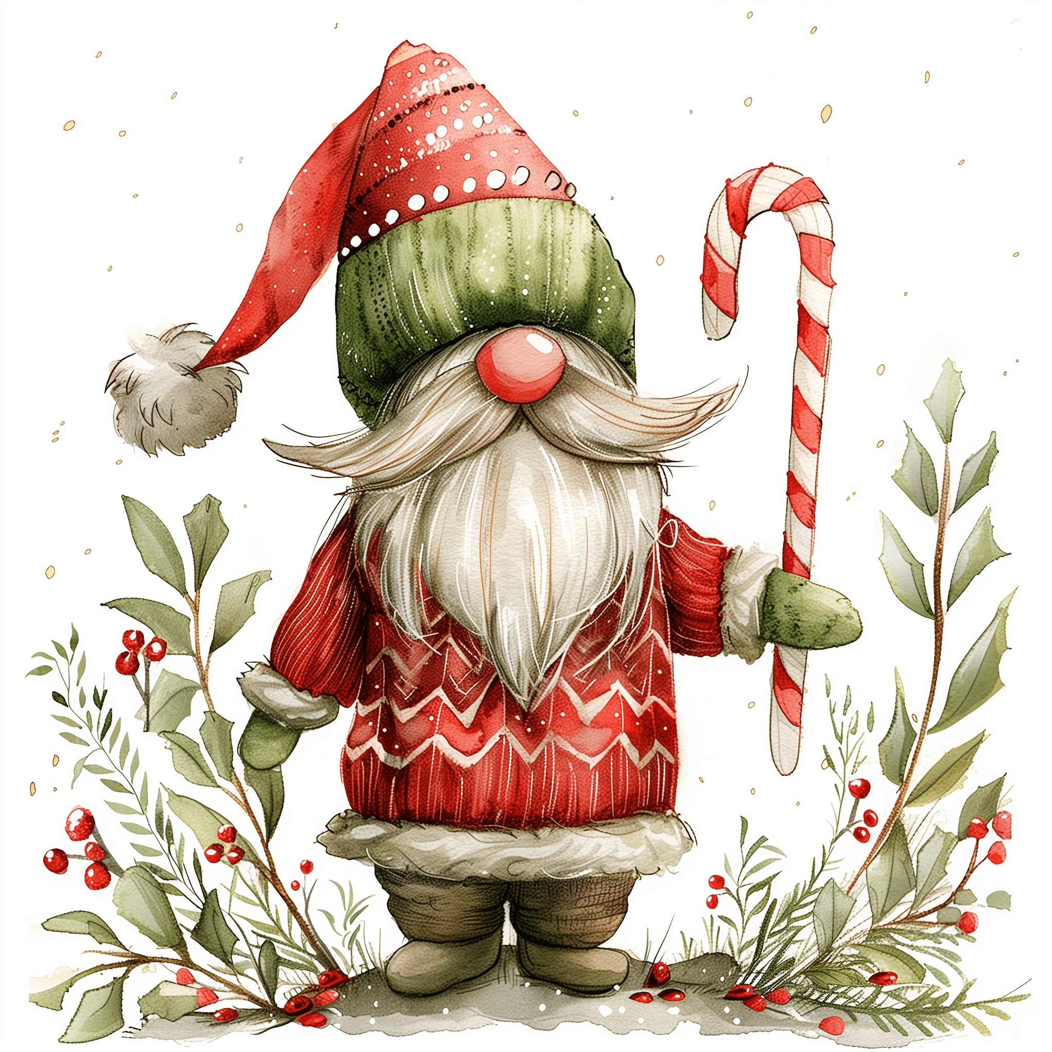 This illustration features a whimsical watercolor gnome dressed in a vibrant red Christmas sweater and a green Santa hat, joyfully holding a candy cane. The image is set against a clean white background, evoking a charming and festive atmosphere.