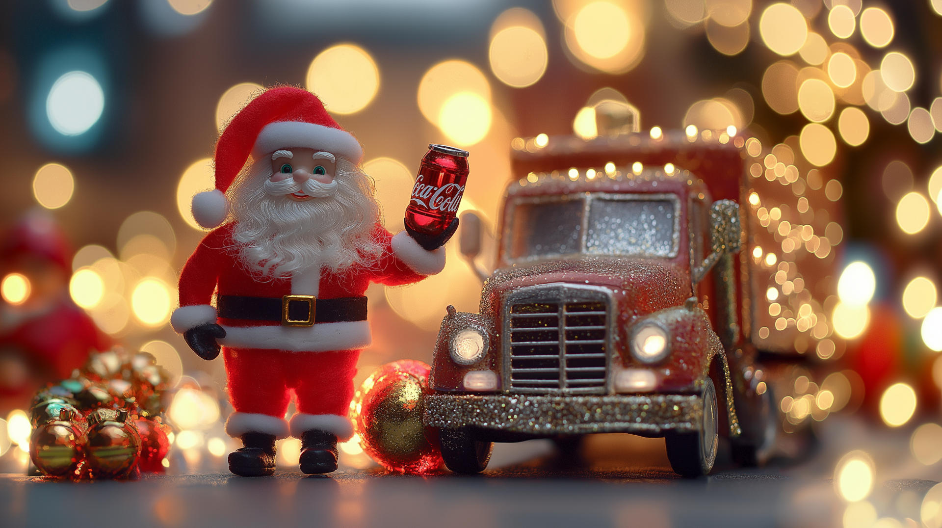 The image portrays a jolly Santa Claus standing beside a festive truck adorned with vibrant Christmas lights. The background features an enchanting bokeh effect that enhances the cheerful holiday atmosphere.