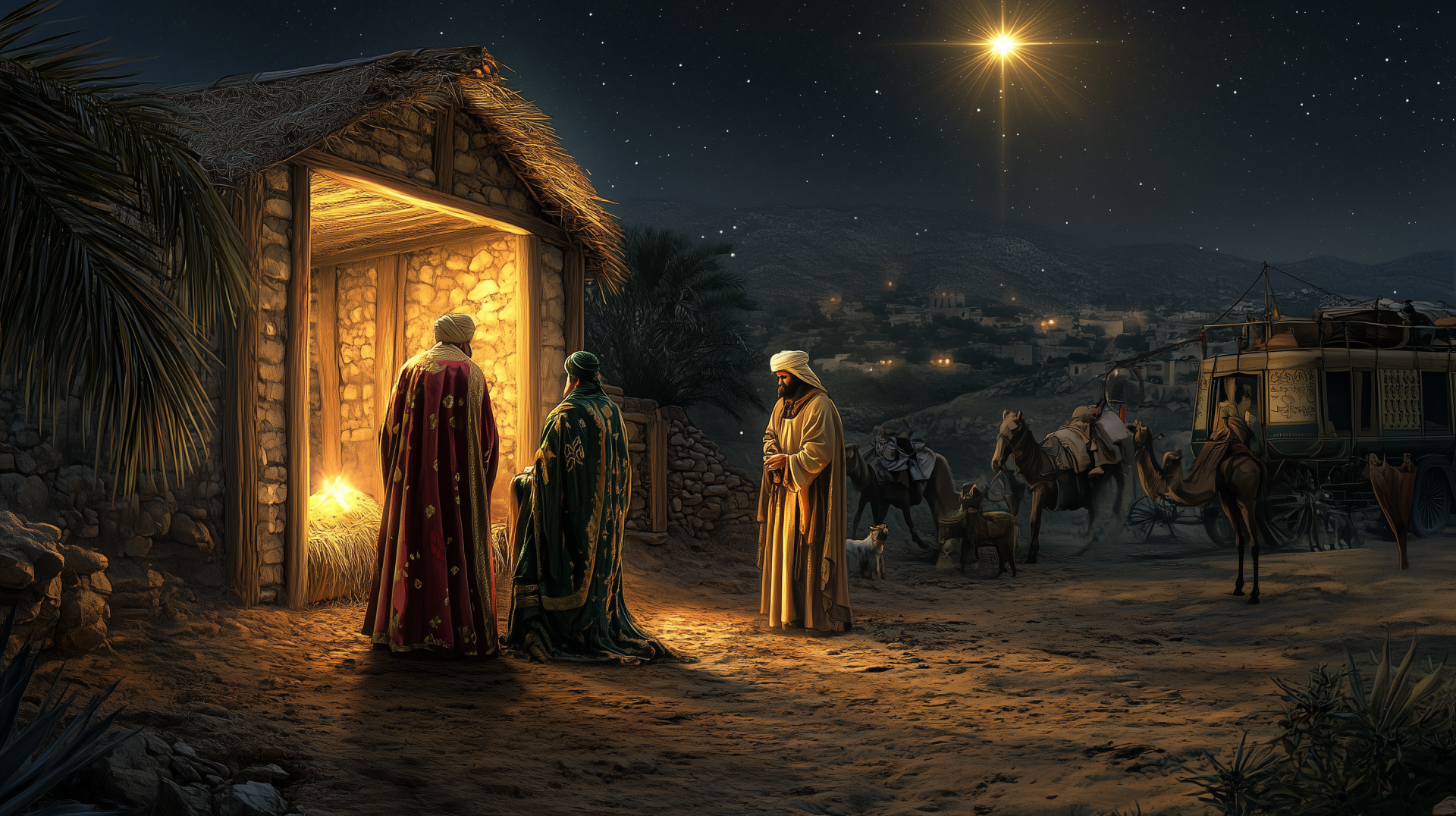 The image captures a serene scene of a rustic stable illuminated by the bright Star of Bethlehem. Three kings, adorned in ornate robes, express awe and reverence as they kneel before the stable, creating an atmosphere of wonder and divinity.