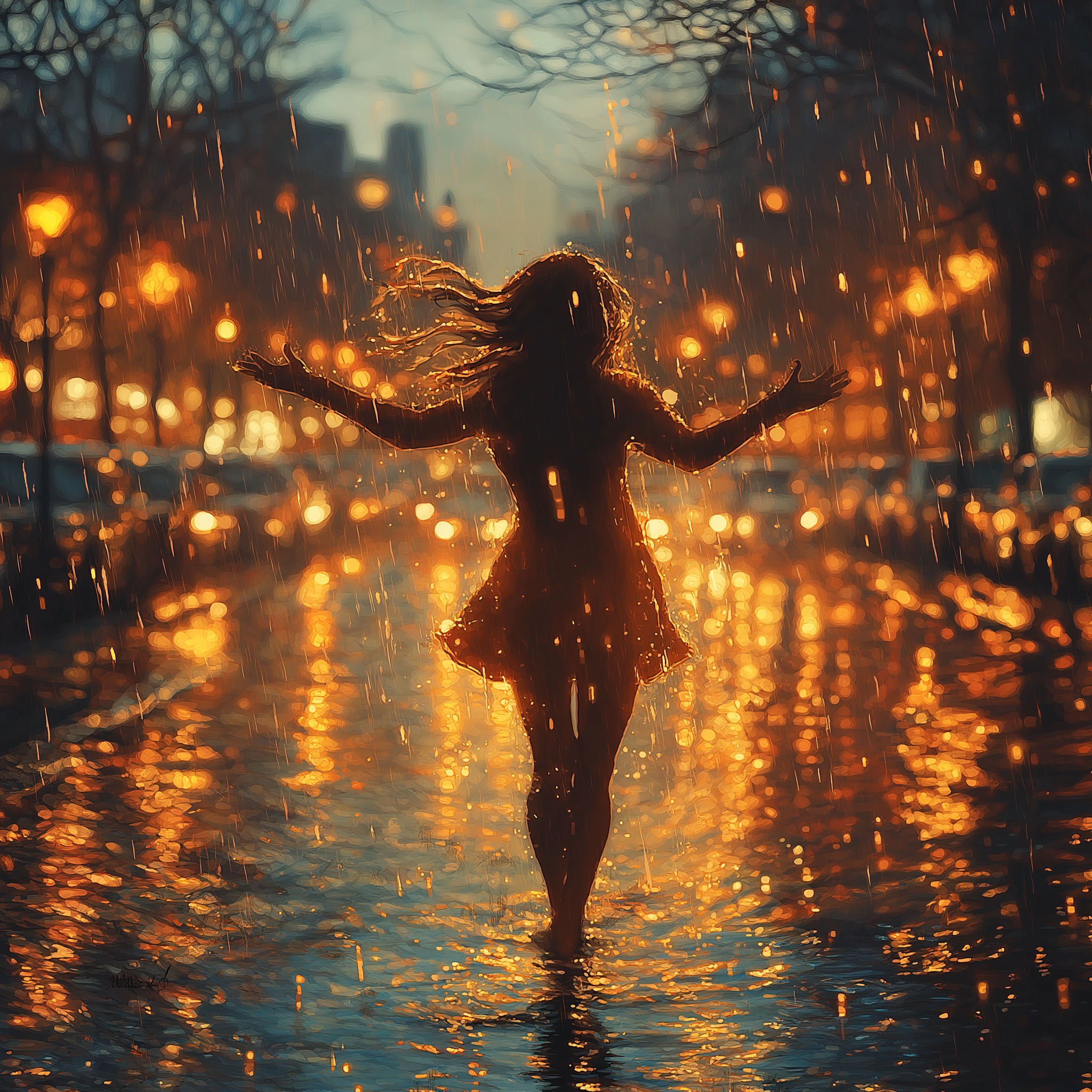 A person dances joyfully in the rain with arms stretched wide, smiling face looking upwards. The urban street is modern and reflects city lights in the wet pavement and puddles, creating a vibrant and warm atmosphere with slightly blurred buildings in the background.