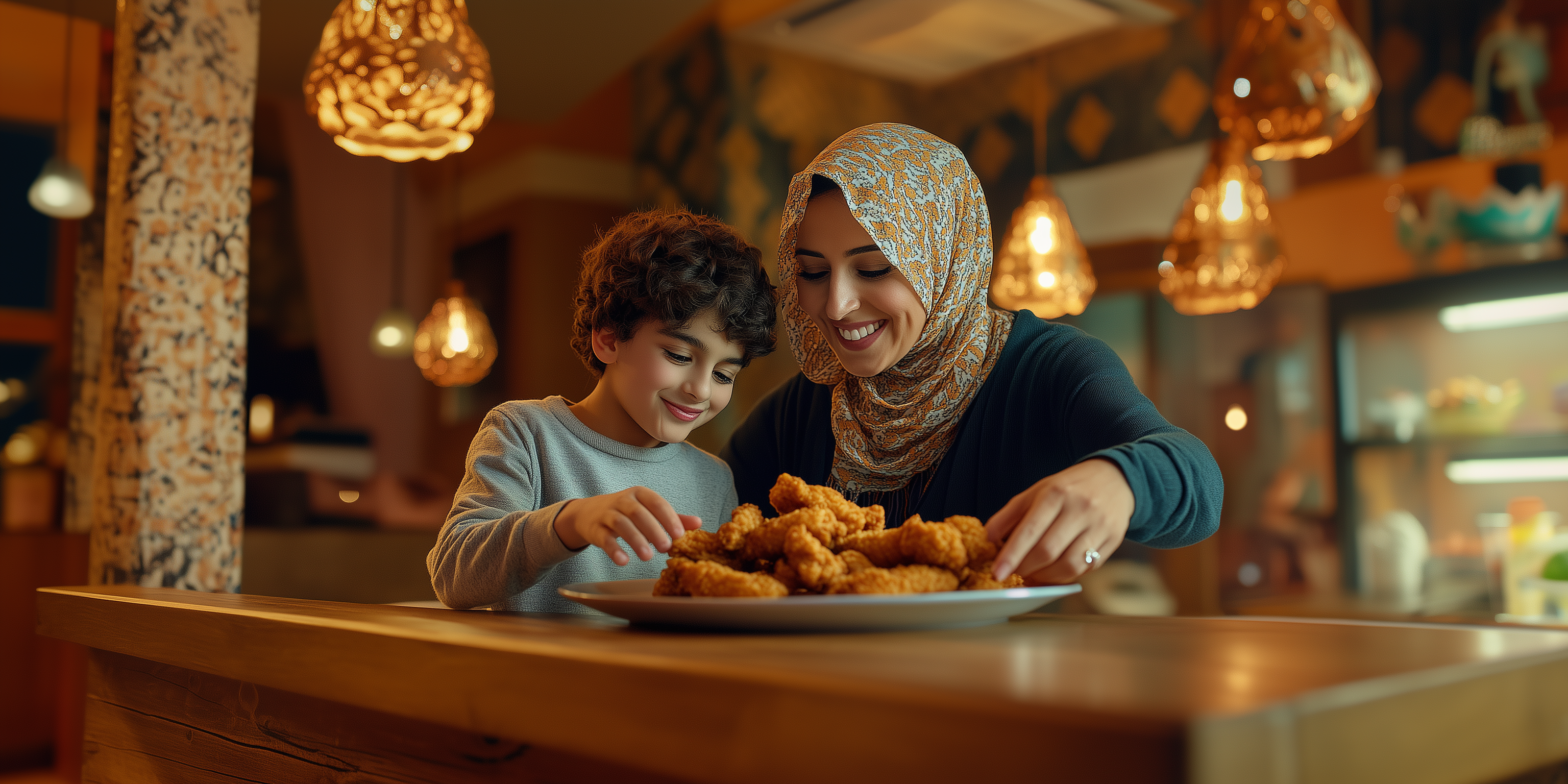 The image captures a warm and joyful Ramadan scene where an adult woman and a young boy are enjoying their Iftar dinner together. They are smiling and standing at a wooden counter with a plate of golden, crispy chicken strips, surrounded by festive Ramadan decorations.