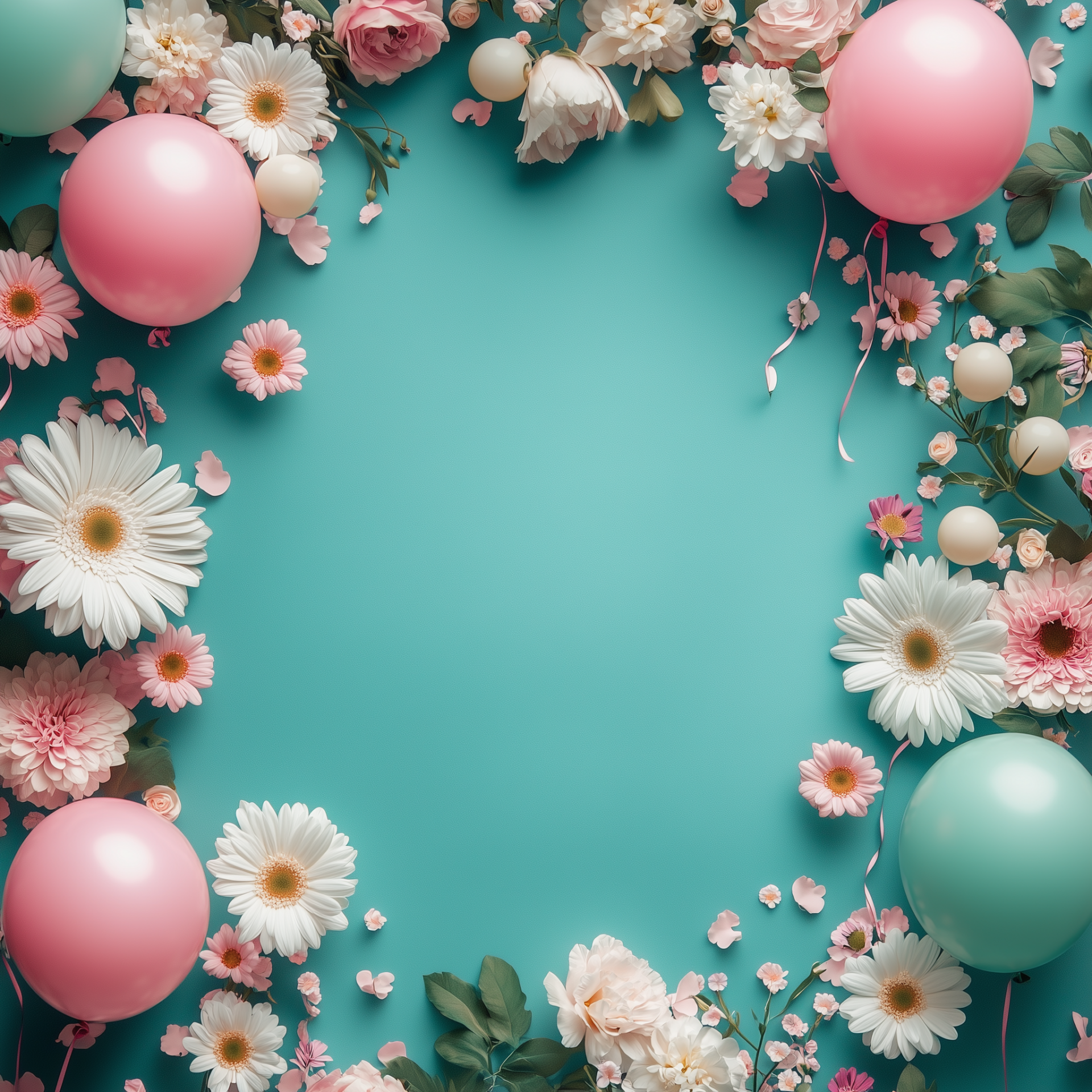 A vibrant arrangement of colorful flowers and balloons creates a festive atmosphere. The teal background enhances the celebratory feel, making it ideal for an anniversary celebration.