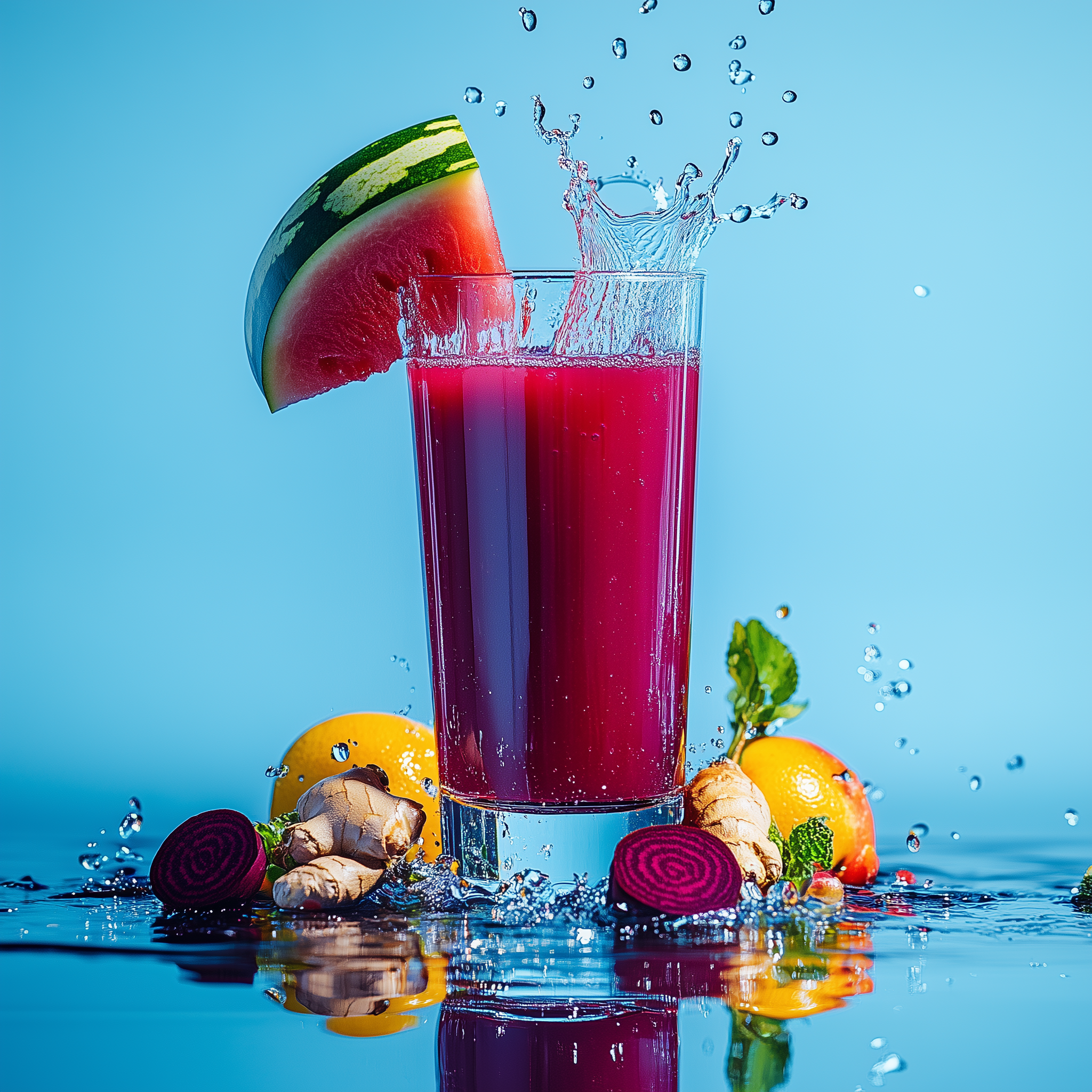 The image showcases a vibrant glass of fruit juice, reflecting beautifully against a deep blue background. Water splashes surround the glass, adding a dynamic freshness, embellished with decorative slices of ginger, watermelon, apple, and beetroot.