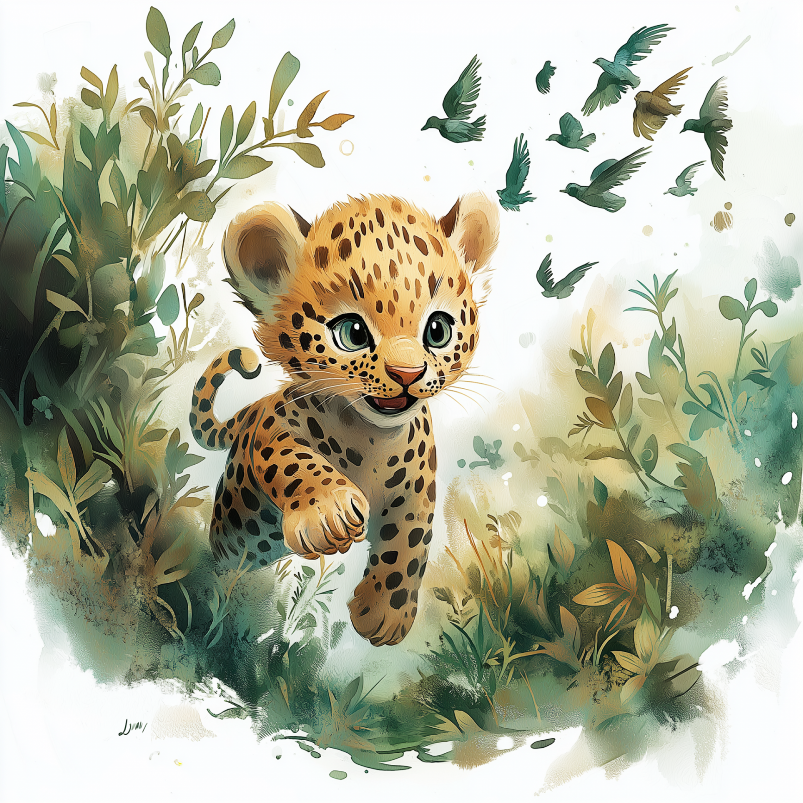 This watercolor illustration captures a spirited leopard cub in mid-run, dashing through a vibrant jungle. Surrounding the cub, colorful foliage and a flock of startled birds take flight from a nearby tree, creating a dynamic and lively scene.