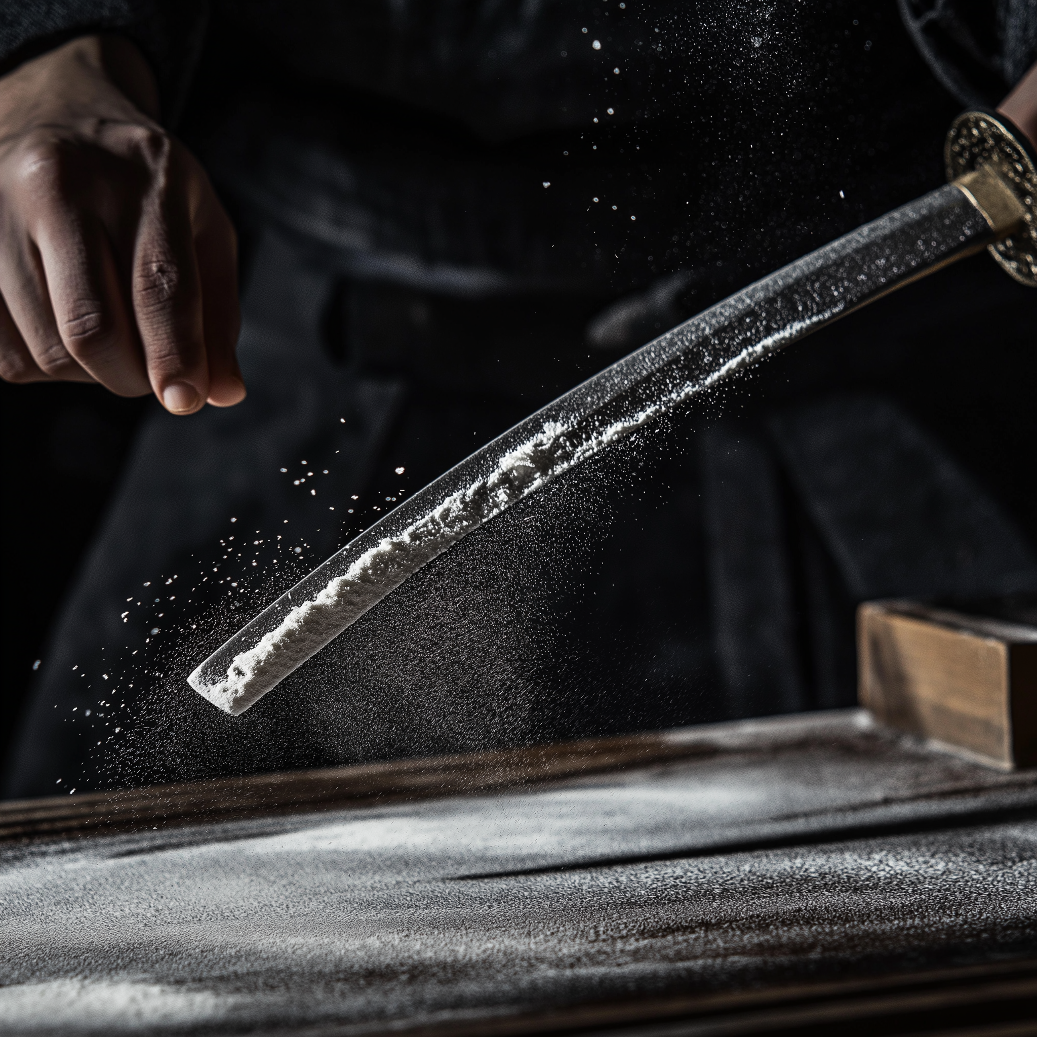 The image showcases a katana blade that has been meticulously cleaned, showing its gleaming surface with a light dusting of powder. The reflective quality of the blade contrasts beautifully with the delicate powder sprinkled on it, enhancing the artistry of the weapon.