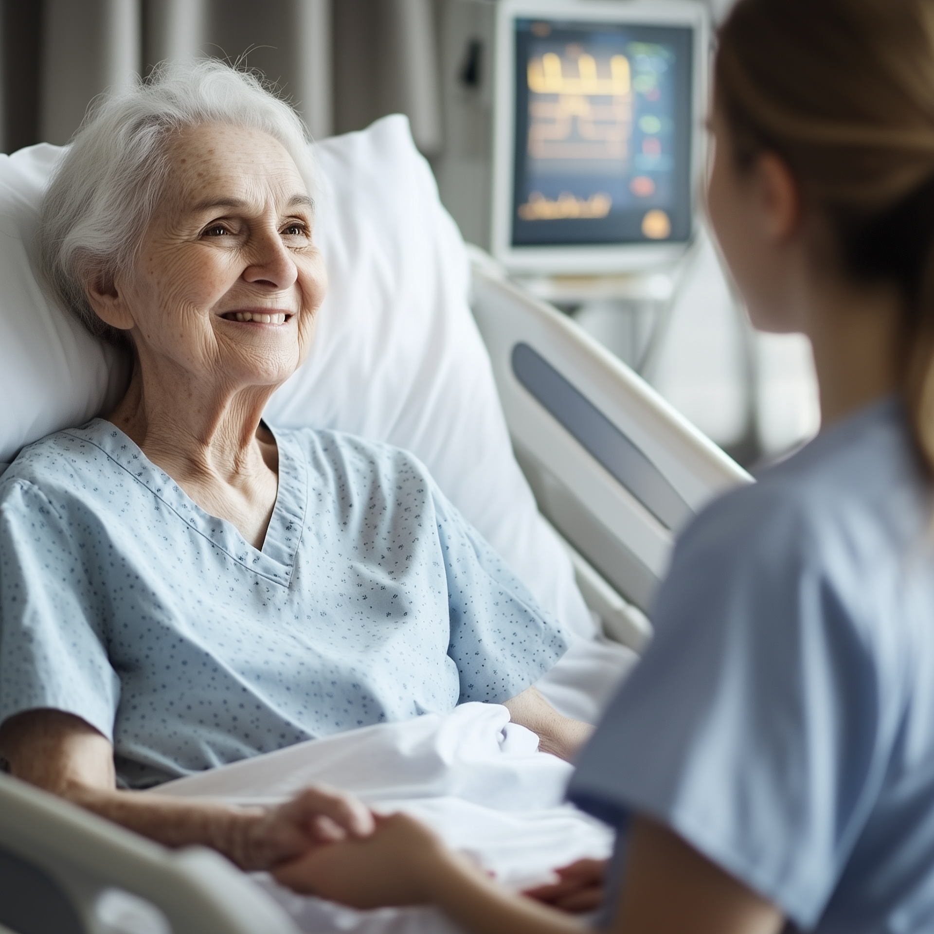 This image captures a warm and tender moment between an elderly woman resting in a hospital bed and a young nurse by her side. The gentle expressions convey a sense of compassion and care in a hospital setting.