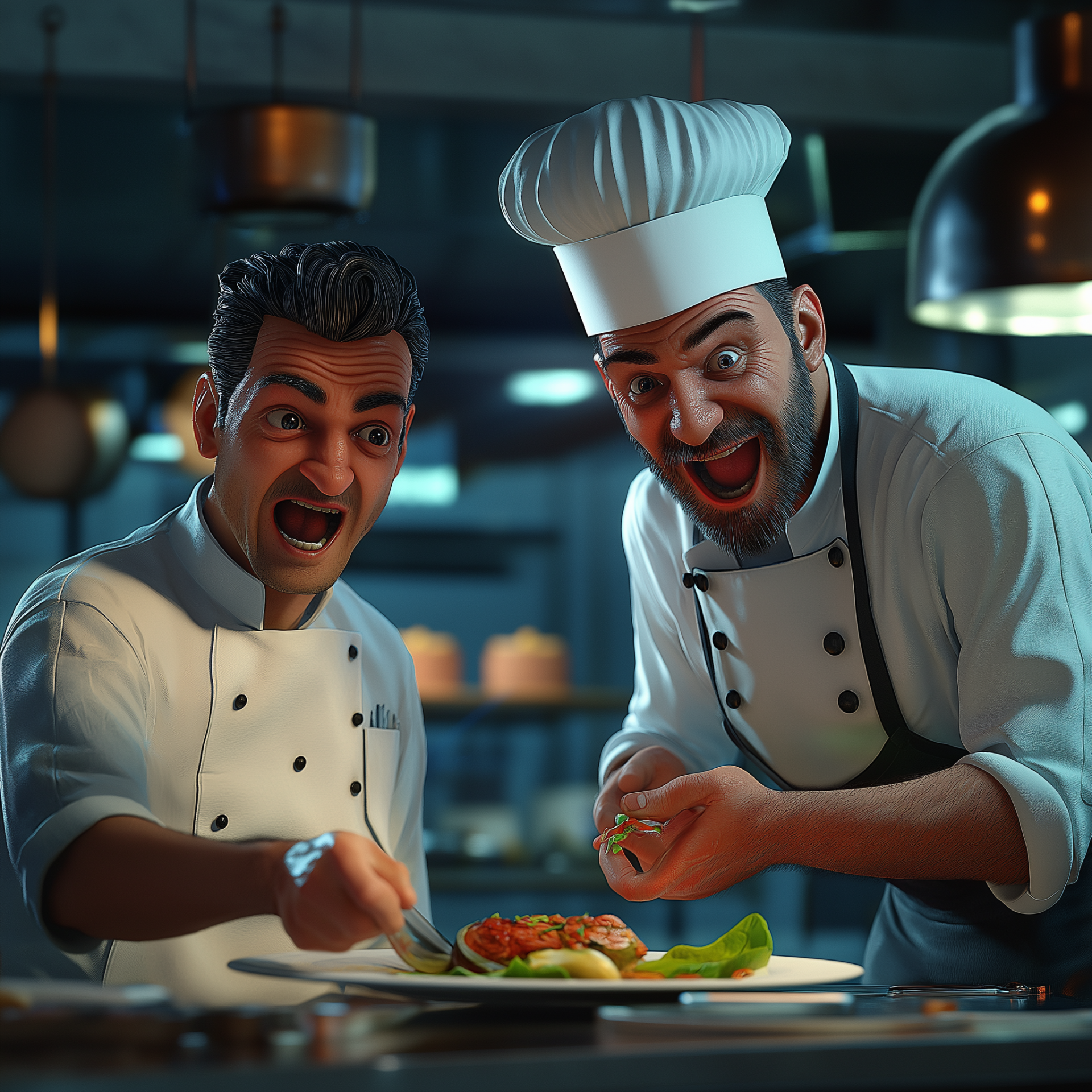 This image captures a vibrant, high-quality scene set in a kitchen, showcasing two chefs experiencing contrasting reactions to a dish. One chef seems delighted and curious, while the other is visibly horrified, creating a humorous tension in the moment.