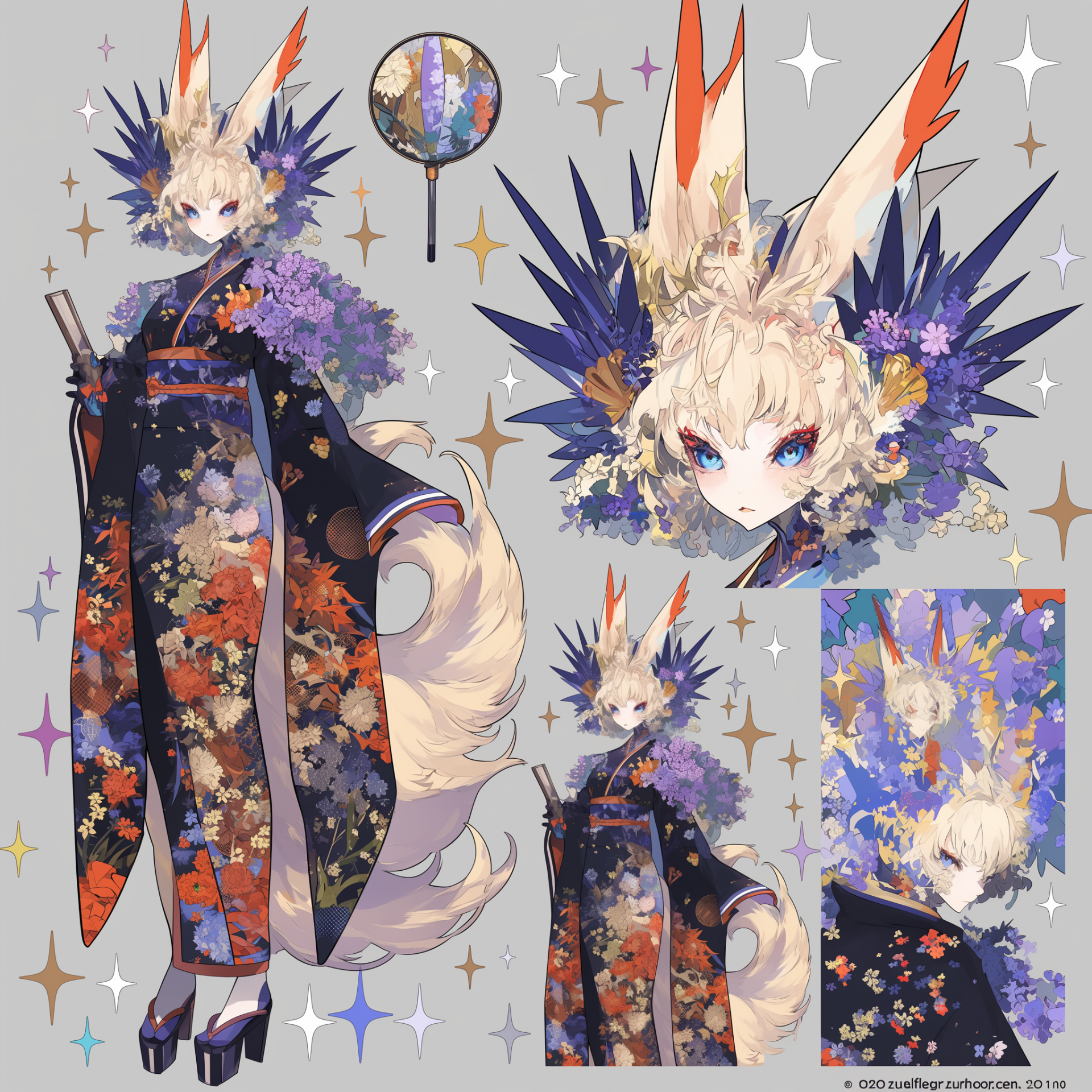 The image features a kitsune character with striking red hair and blue eyes, dressed in a vibrant red Asian kimono. The character's face is adorned with intricate patterns, and they hold a fan while standing tall, exuding a sense of elegance and charm.