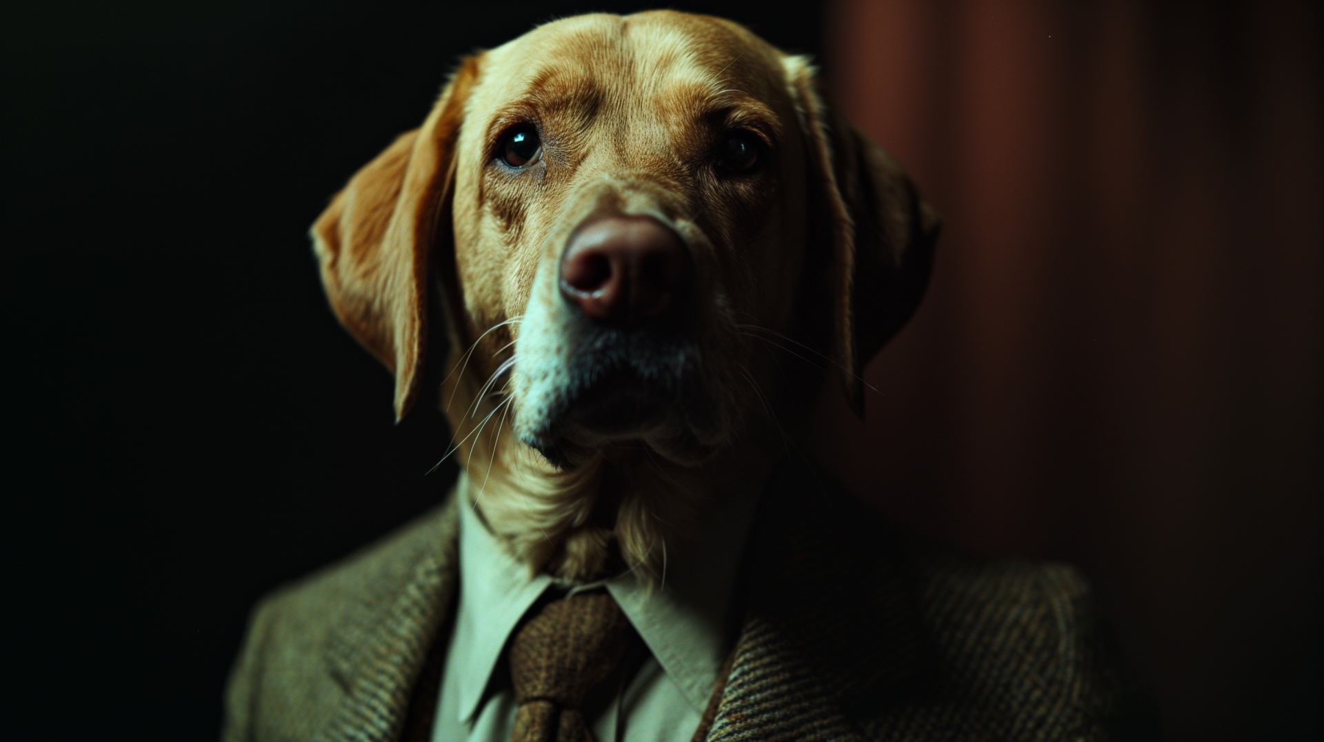 The image features a Labrador Retriever dressed in an oversized suit and loose tie, exuding a sense of anxiety and fear. The dramatic lighting and shallow depth of field emphasize the dog's expressive eyes and the tension of the moment.