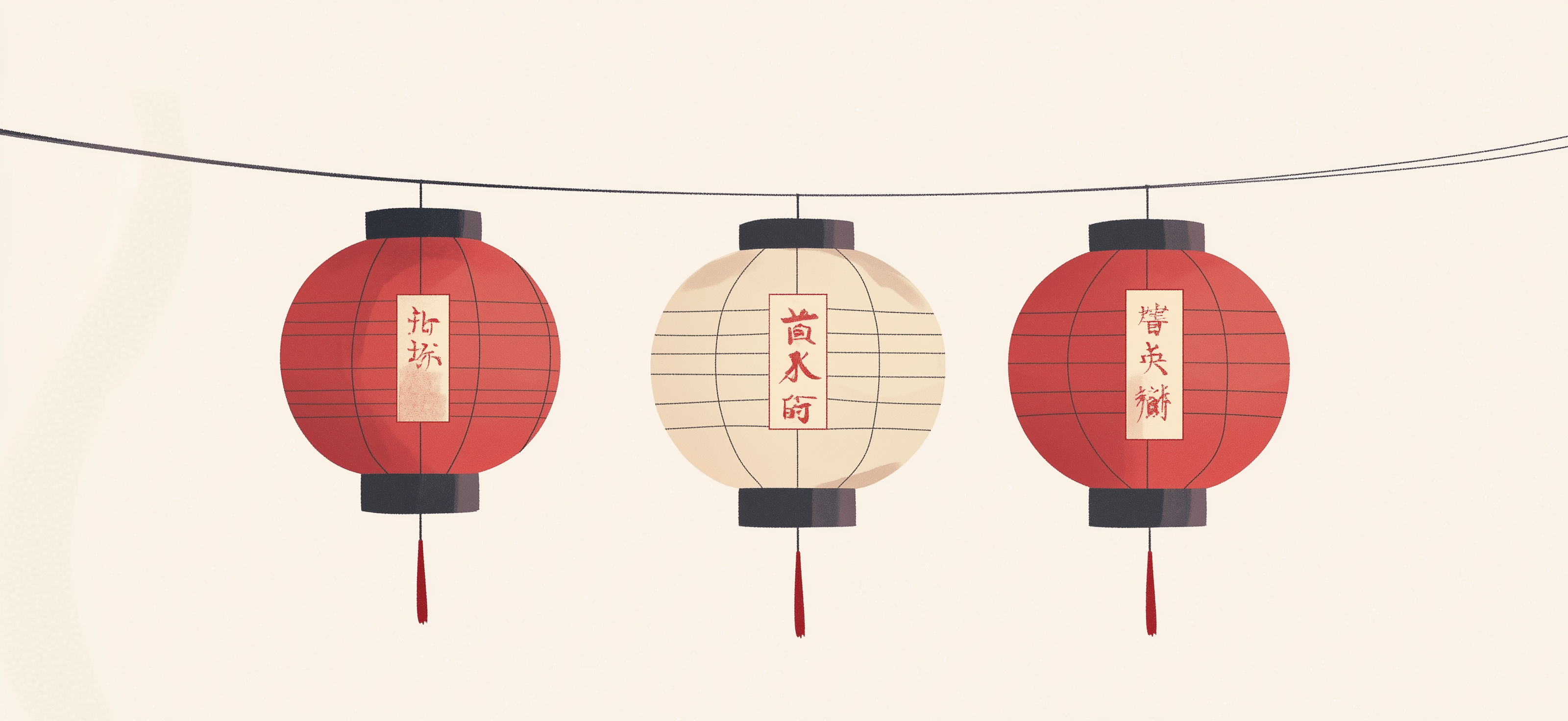 This image features a simple flat vector illustration of Japanese lanterns. The design showcases three red lanterns and one cream lantern set against a clean white background, creating a minimalist and vibrant aesthetic.